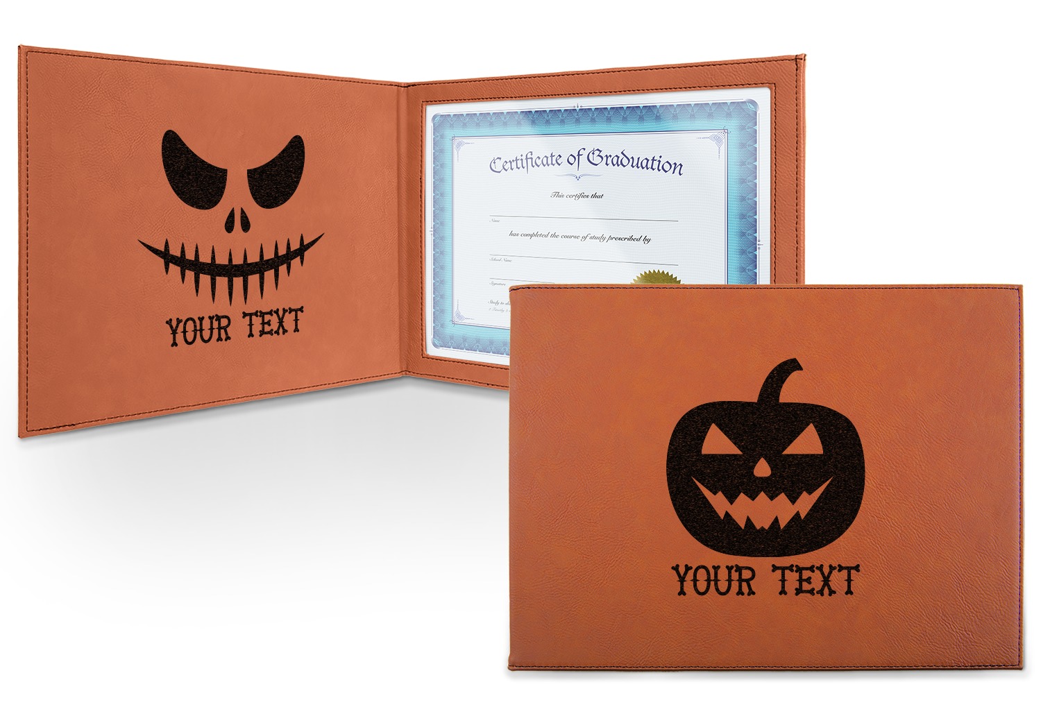This cognac-colored, leatherette certificate jacket is the ideal way to display or store your hard-earned certificate. When closed, the custom certificate holder measures at 12 by 9 inches. The interior of the certificate cover includes a clear, vinyl window to encase your diploma. The window measures at around 10.5 by 7.5 inches and can accommodate a diploma that measures at up to 8.5 by 11 inches. You can either choose to have your customization laser engraved on the front and interior, or solely the front.