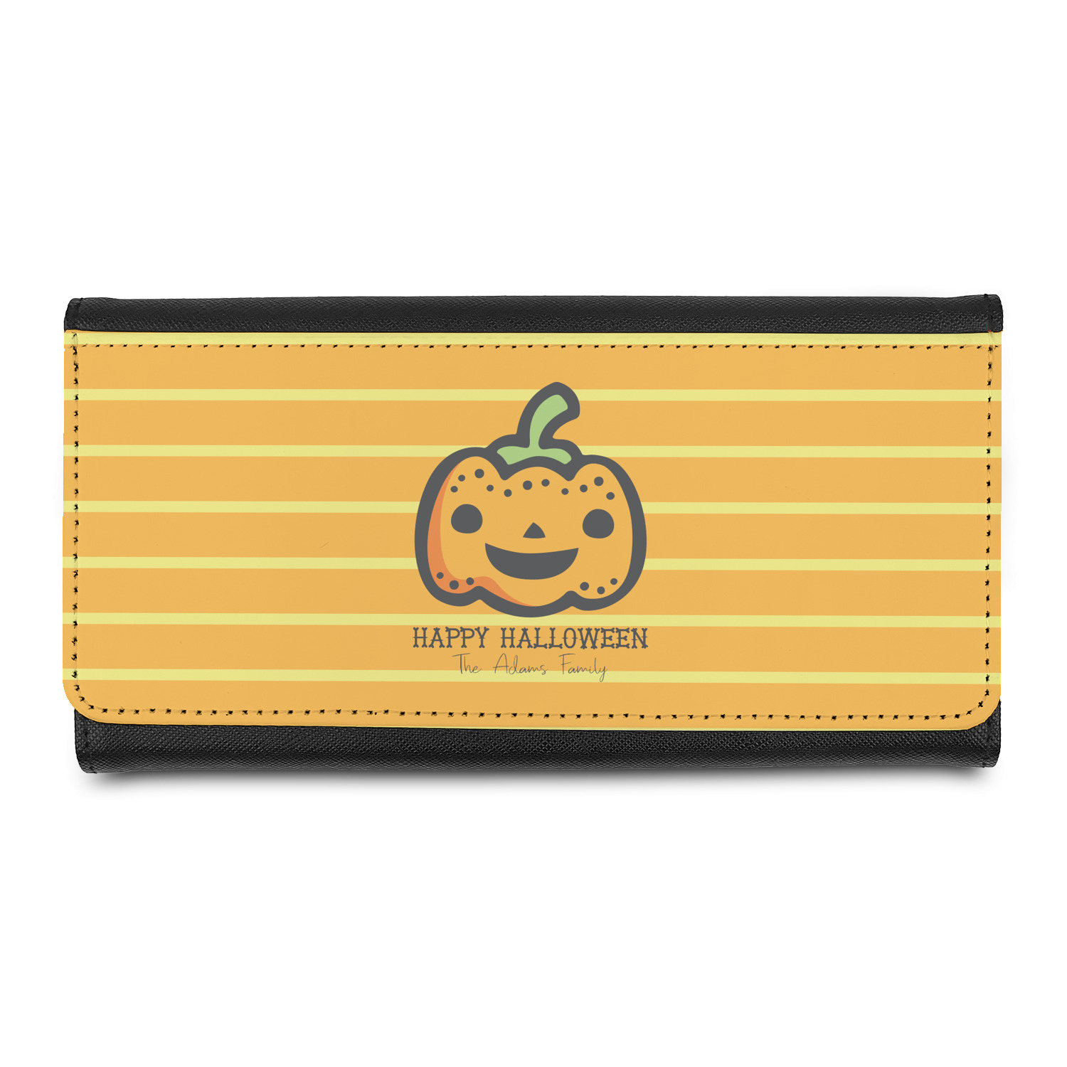 The design features a fun-loving pumpkin as the main focus. He even has a cute little smile on his face that will make you smile right back. The background is a subtle striped one with yellow and orange as the colors. Your personalization or greeting goes directly underneath your pumpkin friend. The coordinating design even has a cute little ghost who thinks that you are "bootiful" and "spooktacular."