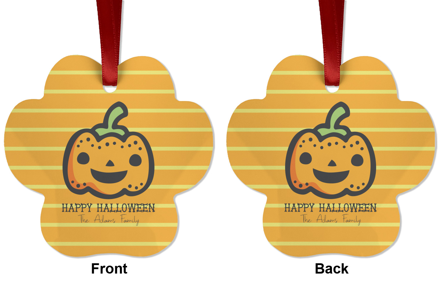 The design features a fun-loving pumpkin as the main focus. He even has a cute little smile on his face that will make you smile right back. The background is a subtle striped one with yellow and orange as the colors. Your personalization or greeting goes directly underneath your pumpkin friend. The coordinating design even has a cute little ghost who thinks that you are "bootiful" and "spooktacular."