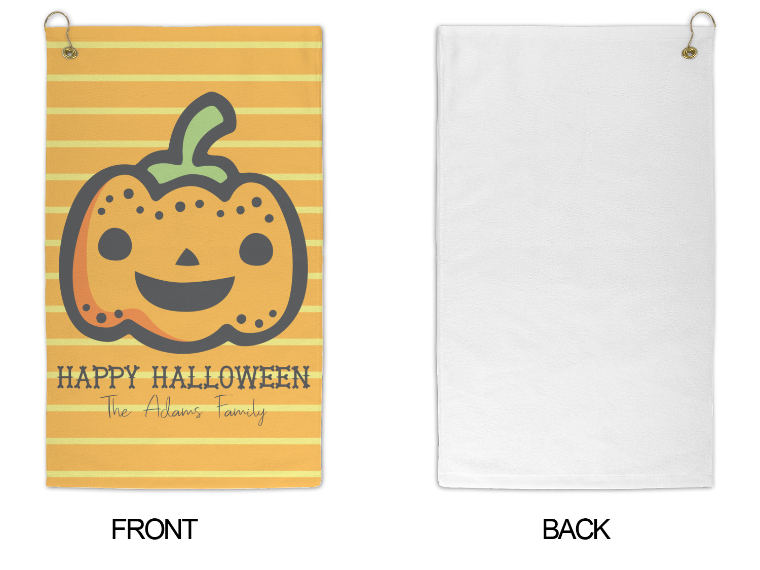 The design features a fun-loving pumpkin as the main focus. He even has a cute little smile on his face that will make you smile right back. The background is a subtle striped one with yellow and orange as the colors. Your personalization or greeting goes directly underneath your pumpkin friend. The coordinating design even has a cute little ghost who thinks that you are "bootiful" and "spooktacular."