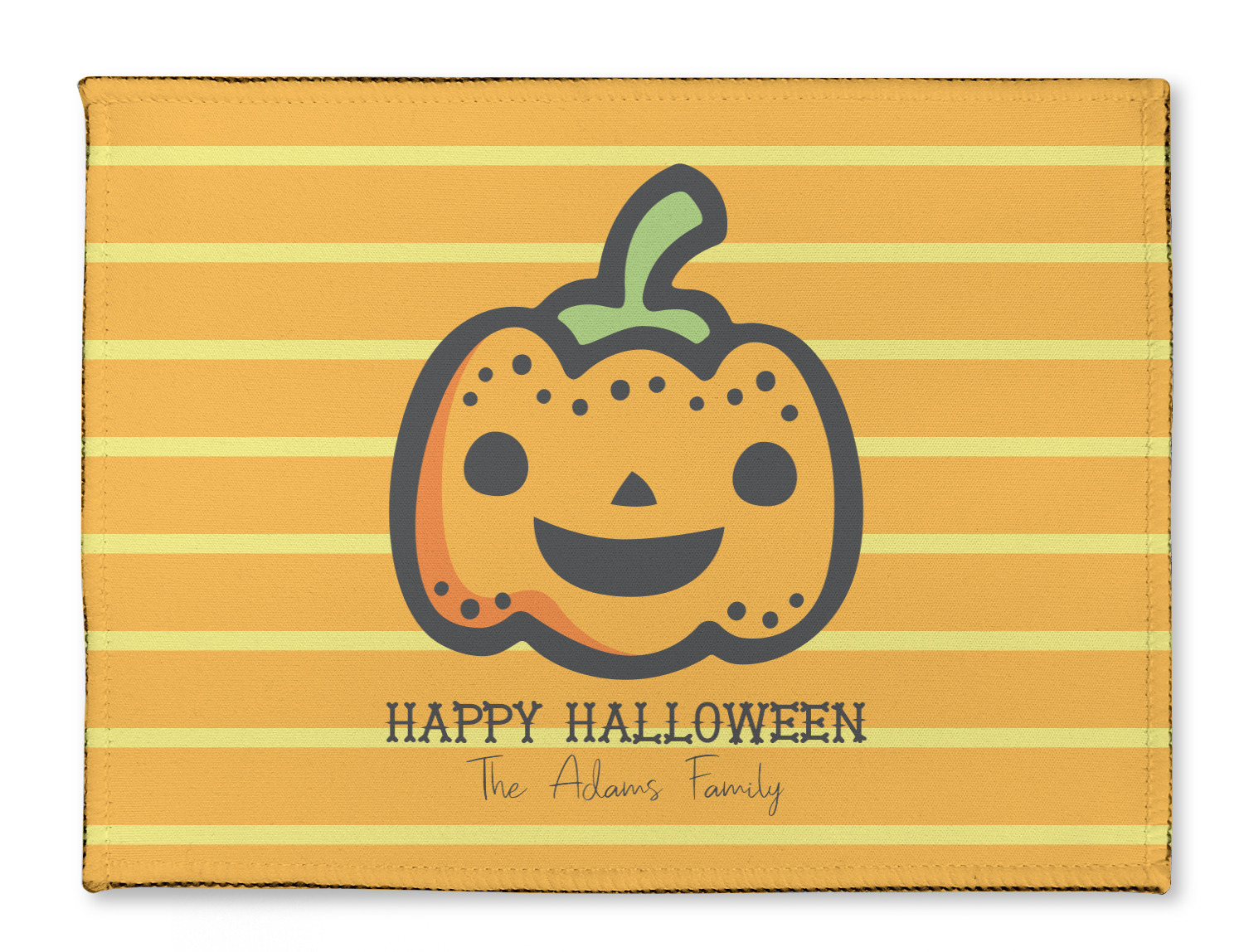 The design features a fun-loving pumpkin as the main focus. He even has a cute little smile on his face that will make you smile right back. The background is a subtle striped one with yellow and orange as the colors. Your personalization or greeting goes directly underneath your pumpkin friend. The coordinating design even has a cute little ghost who thinks that you are "bootiful" and "spooktacular."