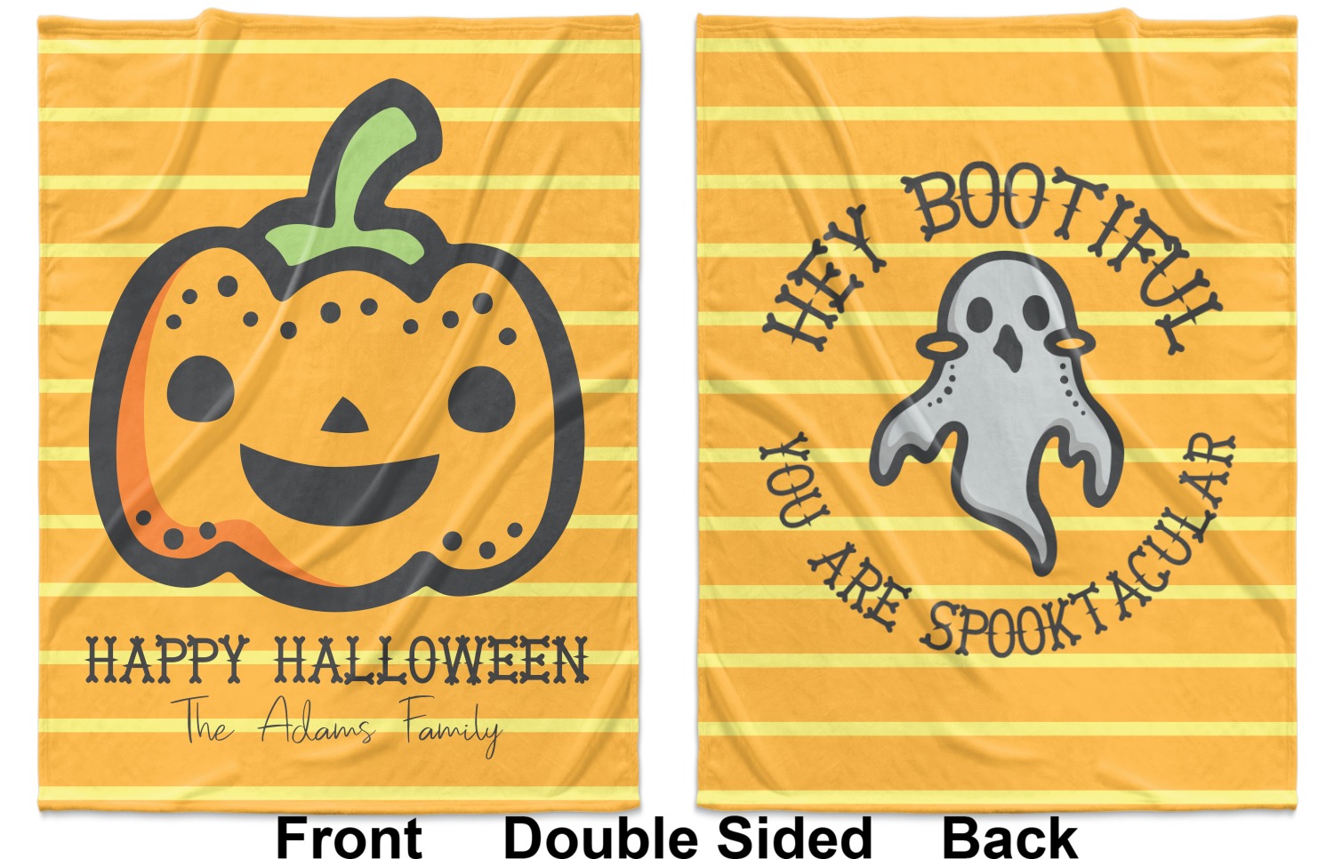 The design features a fun-loving pumpkin as the main focus. He even has a cute little smile on his face that will make you smile right back. The background is a subtle striped one with yellow and orange as the colors. Your personalization or greeting goes directly underneath your pumpkin friend. The coordinating design even has a cute little ghost who thinks that you are "bootiful" and "spooktacular."