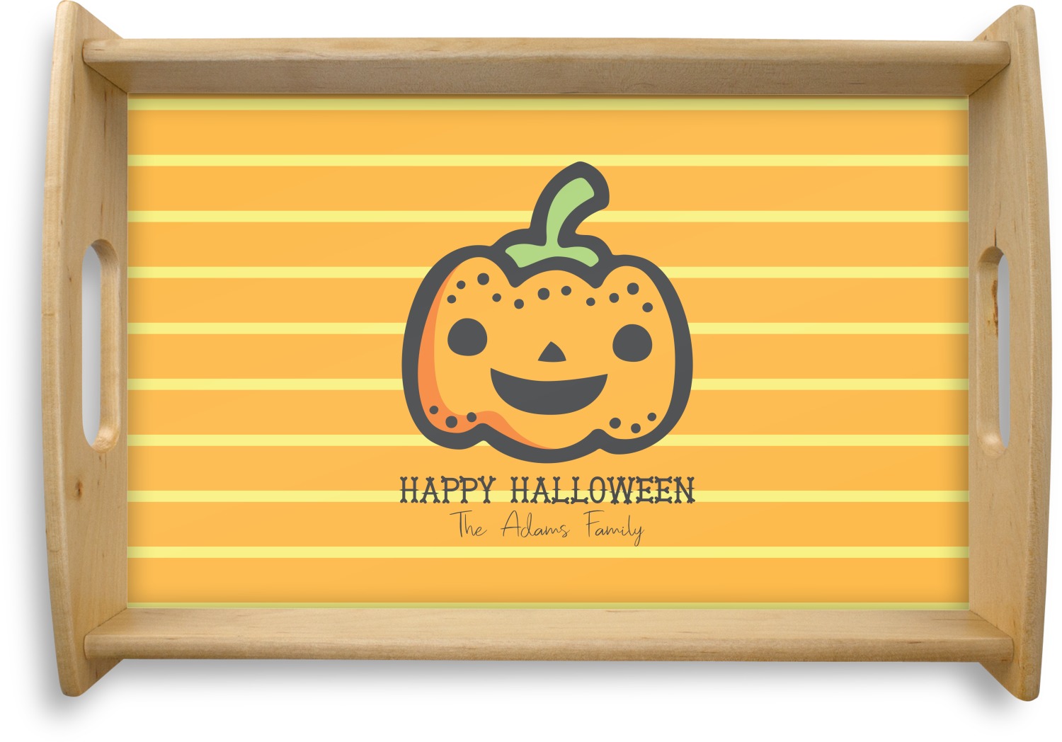 This serving tray with handles features square edges and two rounded sides, creating a very modern look. Each side is fabricated from a beautifully cut, natural wood. The bottom of the interior of the tray displays your customized design in bright, vibrant color. The tray is sold in both a black color and a natural wood look. Each variation of the wood serving tray has two sizes: Small, which is 14" x 10" x 2.25", and Large, which is 19.5" x 13.5" x 2.75".