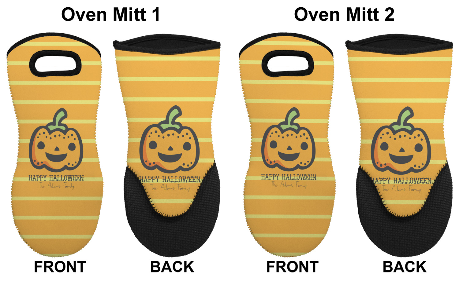 These heat resistant gloves are made entirely of a durable neoprene; the front features a softer texture, while the palm's side has a textured surface, meant to handle heat up to 500 degrees Fahrenheit. Thick, heavy duty stitching connects the two sides. A small, oval cutout appears on the front, and can be used to hang and store the mitt. Your personalization appears on the front, and the upper part of the back of the mitt. The style of these oven mitts are suitable for both the right and left hand, depending on your needs. If you need one for each hand, be sure to order two!
