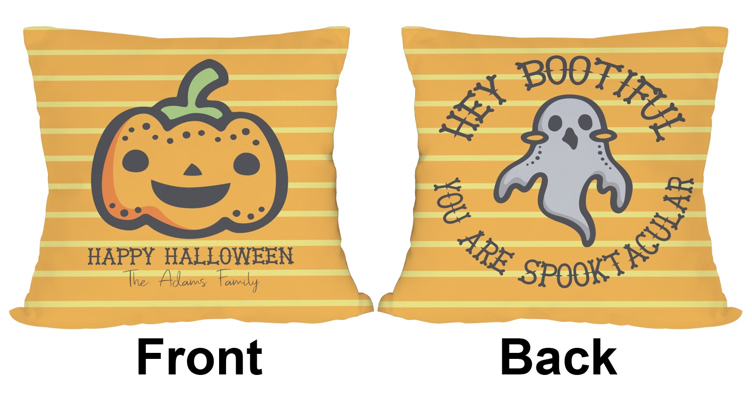 The design features a fun-loving pumpkin as the main focus. He even has a cute little smile on his face that will make you smile right back. The background is a subtle striped one with yellow and orange as the colors. Your personalization or greeting goes directly underneath your pumpkin friend. The coordinating design even has a cute little ghost who thinks that you are "bootiful" and "spooktacular."