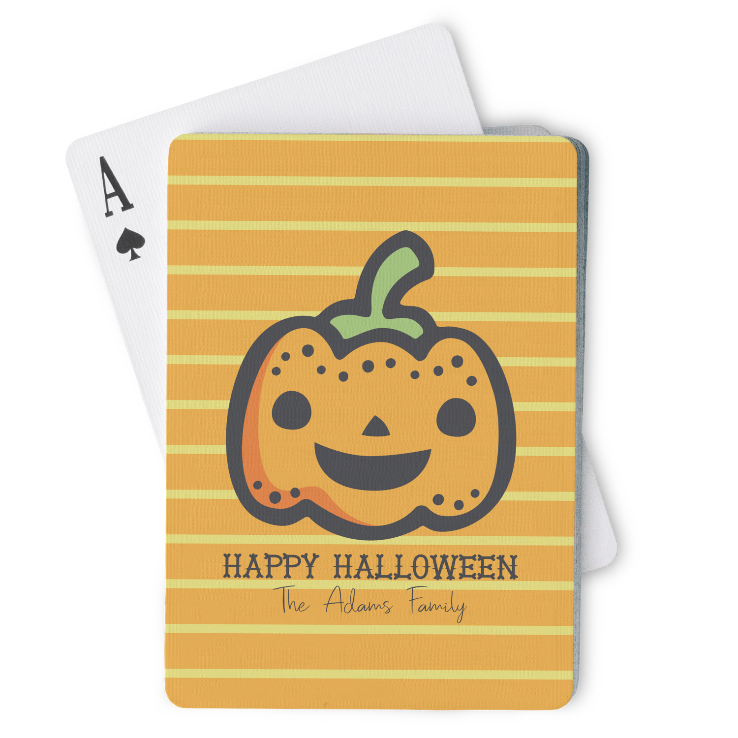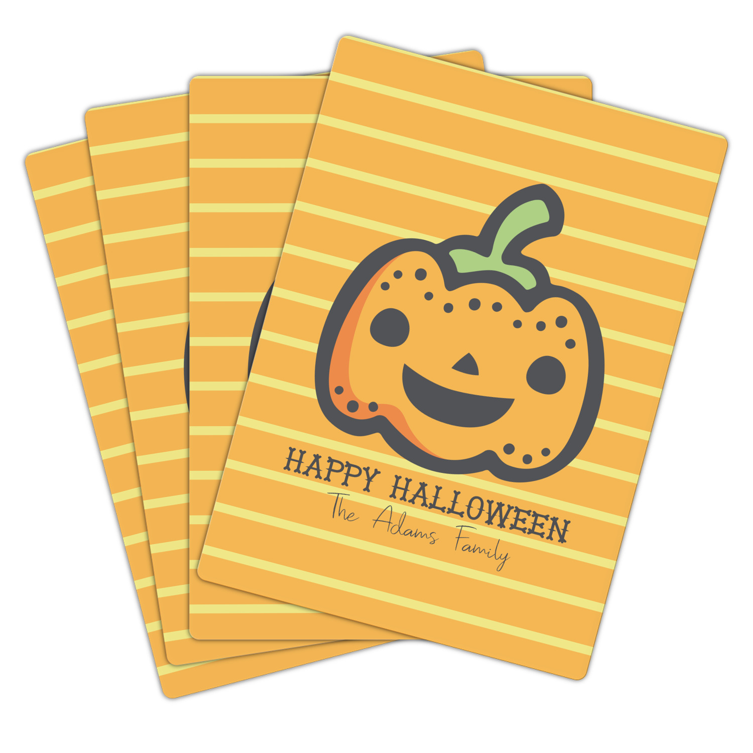 The design features a fun-loving pumpkin as the main focus. He even has a cute little smile on his face that will make you smile right back. The background is a subtle striped one with yellow and orange as the colors. Your personalization or greeting goes directly underneath your pumpkin friend. The coordinating design even has a cute little ghost who thinks that you are "bootiful" and "spooktacular."