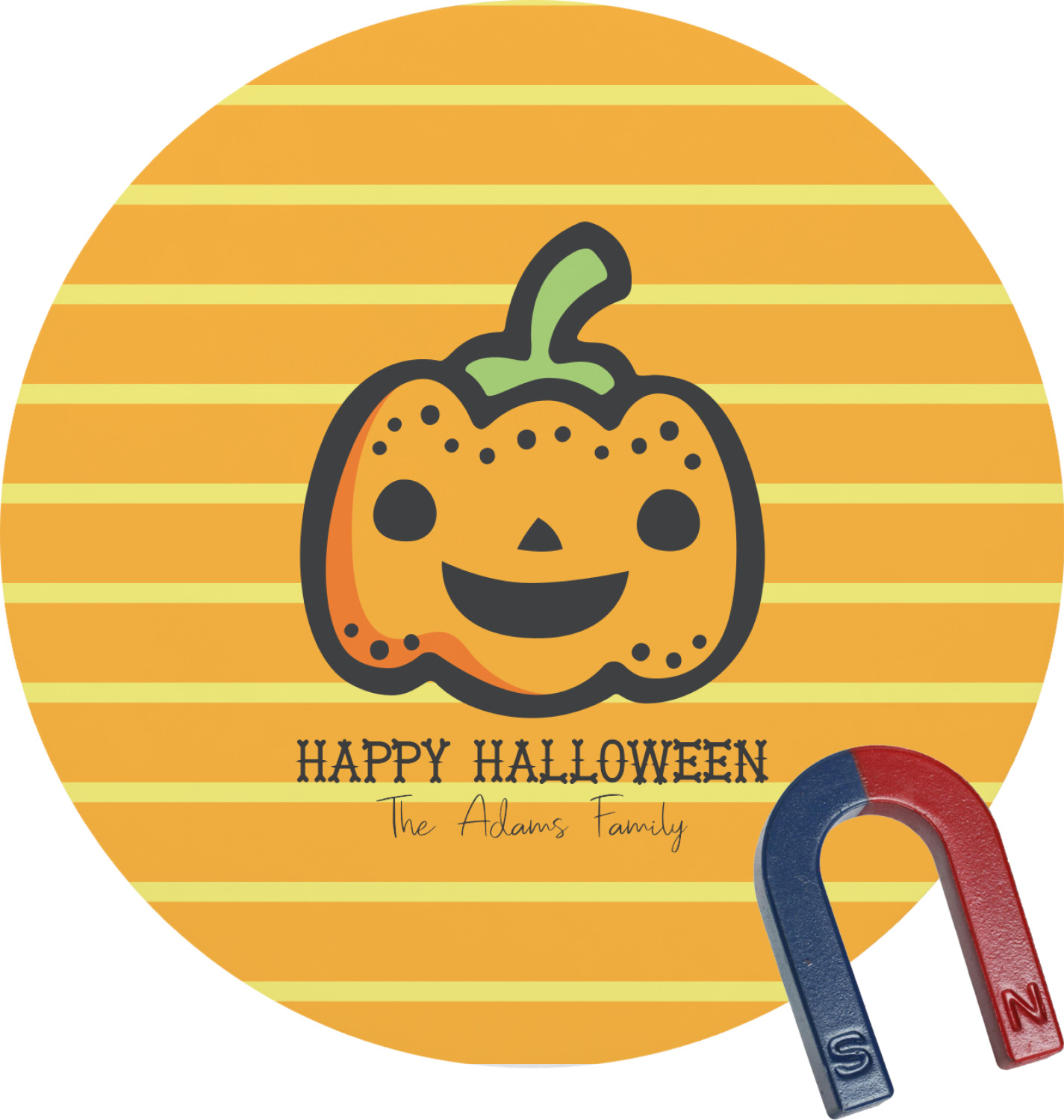 The design features a fun-loving pumpkin as the main focus. He even has a cute little smile on his face that will make you smile right back. The background is a subtle striped one with yellow and orange as the colors. Your personalization or greeting goes directly underneath your pumpkin friend. The coordinating design even has a cute little ghost who thinks that you are "bootiful" and "spooktacular."