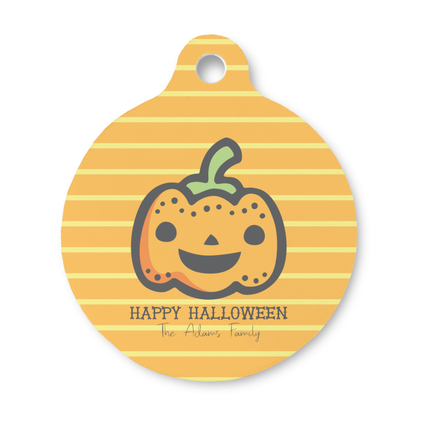 The design features a fun-loving pumpkin as the main focus. He even has a cute little smile on his face that will make you smile right back. The background is a subtle striped one with yellow and orange as the colors. Your personalization or greeting goes directly underneath your pumpkin friend. The coordinating design even has a cute little ghost who thinks that you are "bootiful" and "spooktacular."