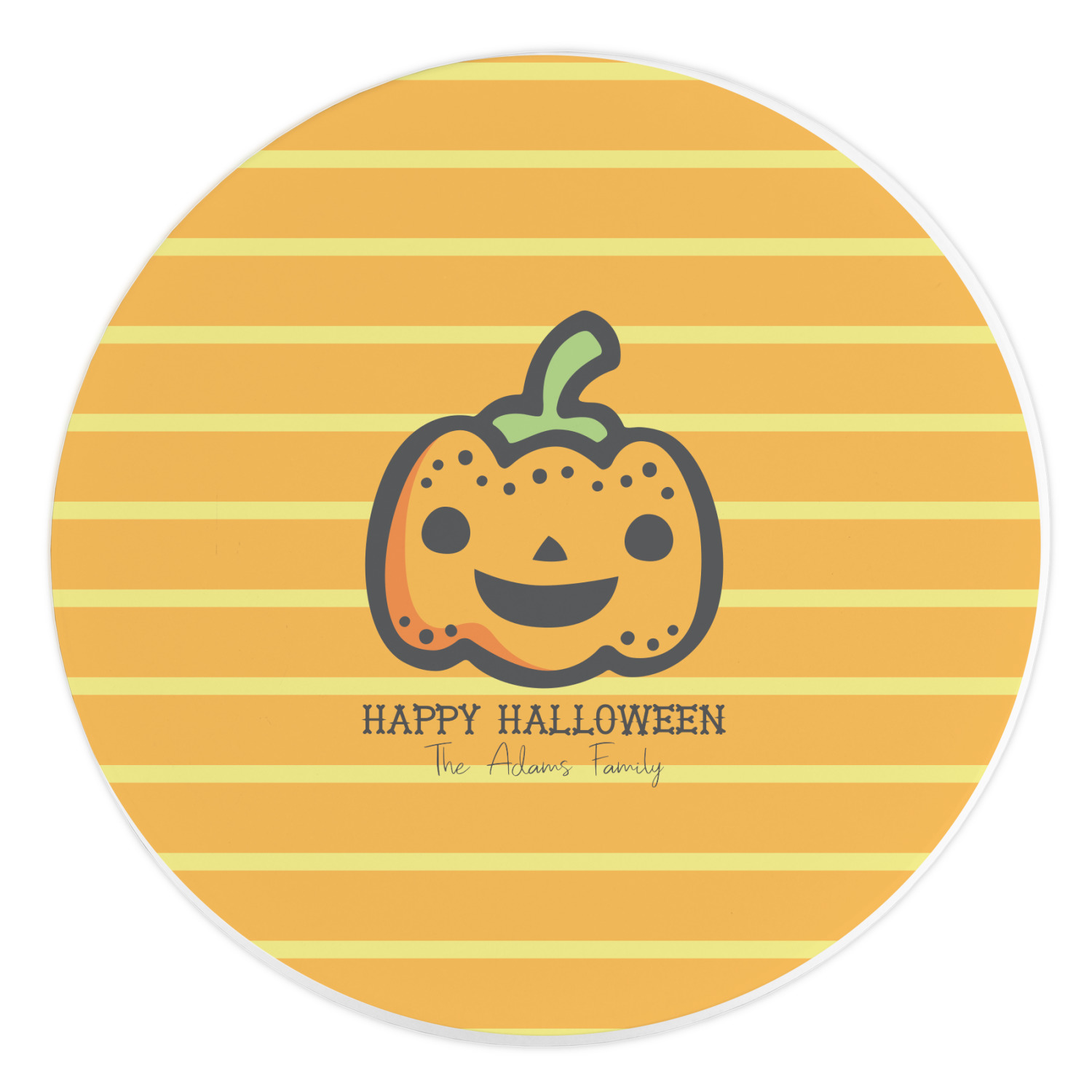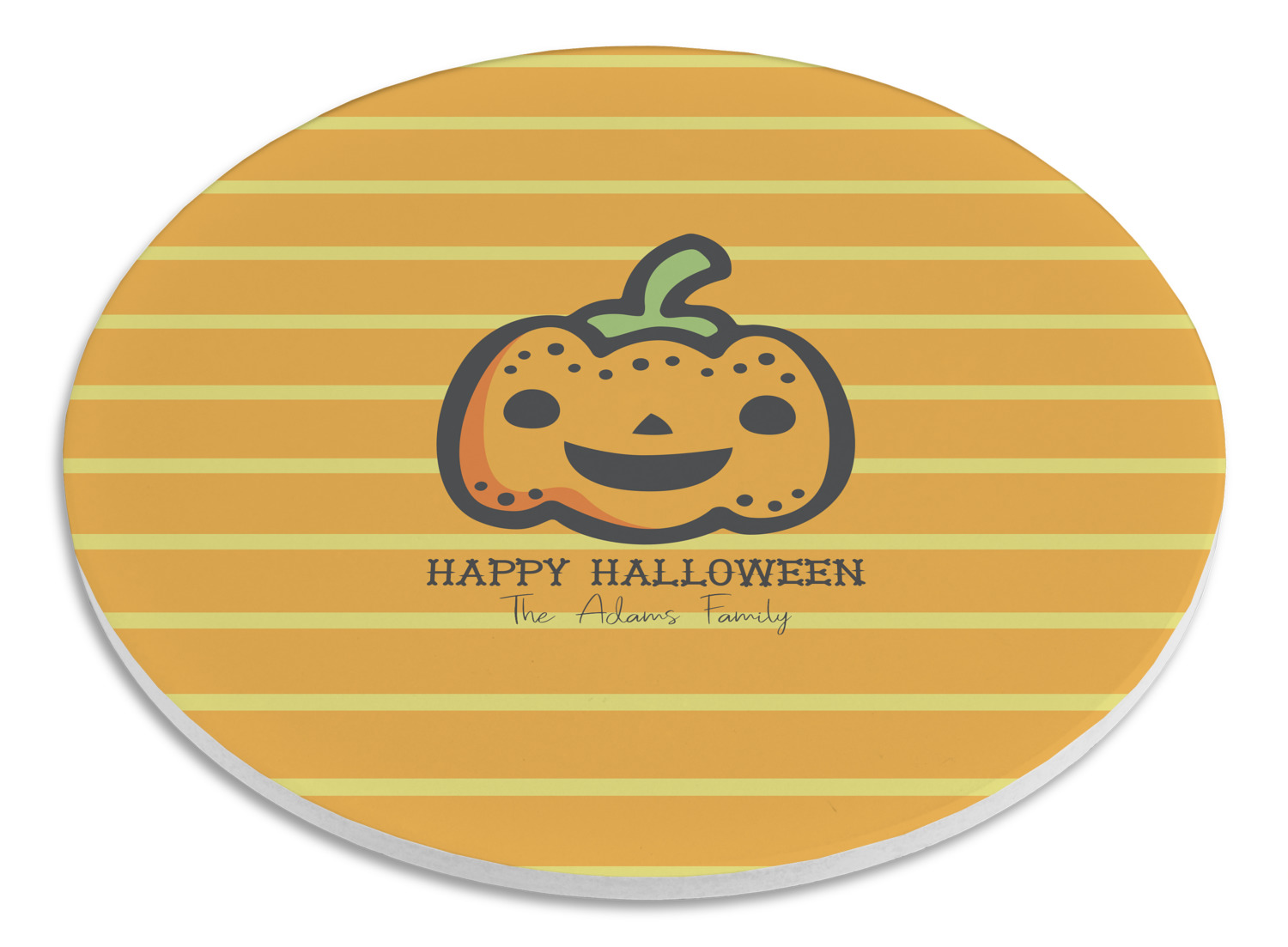 The design features a fun-loving pumpkin as the main focus. He even has a cute little smile on his face that will make you smile right back. The background is a subtle striped one with yellow and orange as the colors. Your personalization or greeting goes directly underneath your pumpkin friend. The coordinating design even has a cute little ghost who thinks that you are "bootiful" and "spooktacular."