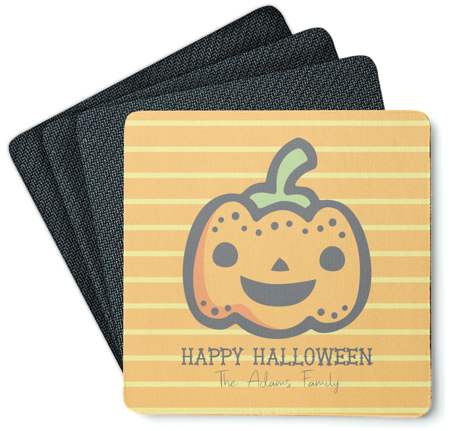 The design features a fun-loving pumpkin as the main focus. He even has a cute little smile on his face that will make you smile right back. The background is a subtle striped one with yellow and orange as the colors. Your personalization or greeting goes directly underneath your pumpkin friend. The coordinating design even has a cute little ghost who thinks that you are "bootiful" and "spooktacular."