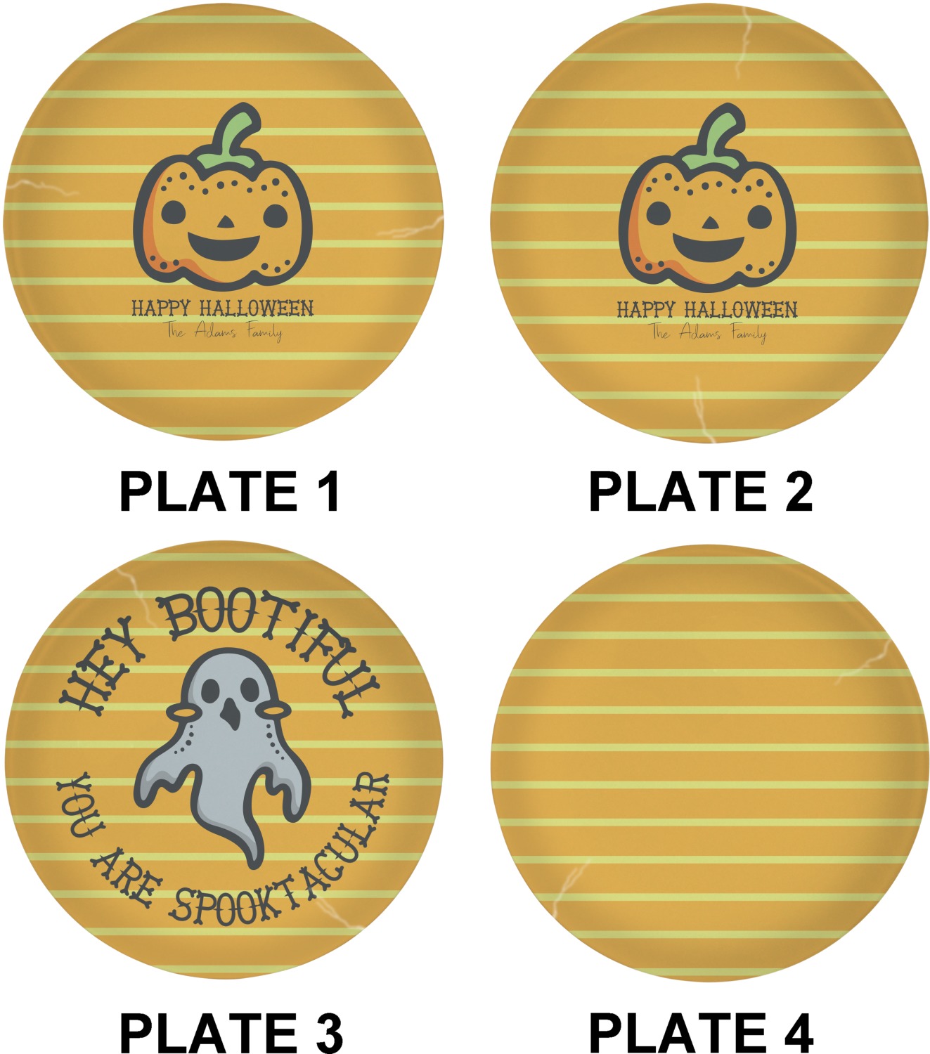 The design features a fun-loving pumpkin as the main focus. He even has a cute little smile on his face that will make you smile right back. The background is a subtle striped one with yellow and orange as the colors. Your personalization or greeting goes directly underneath your pumpkin friend. The coordinating design even has a cute little ghost who thinks that you are "bootiful" and "spooktacular."