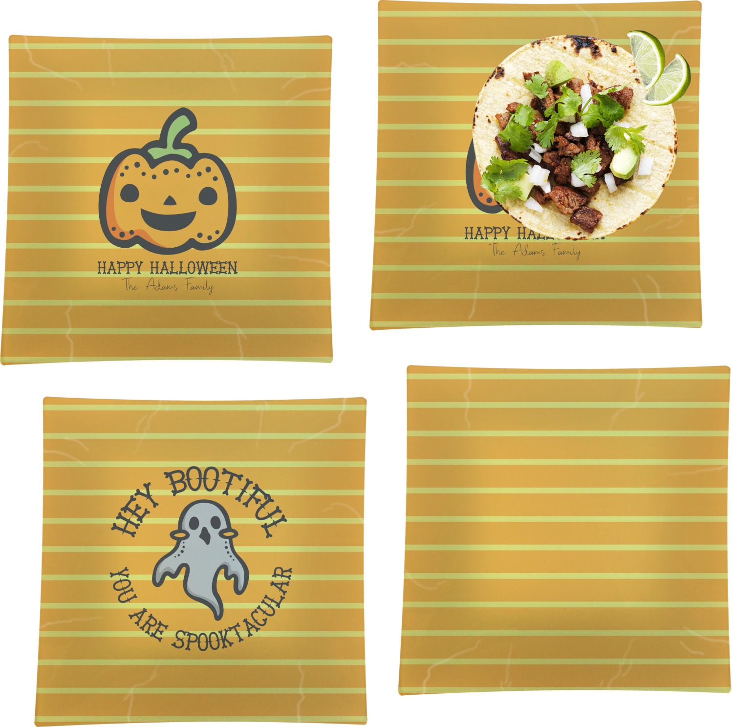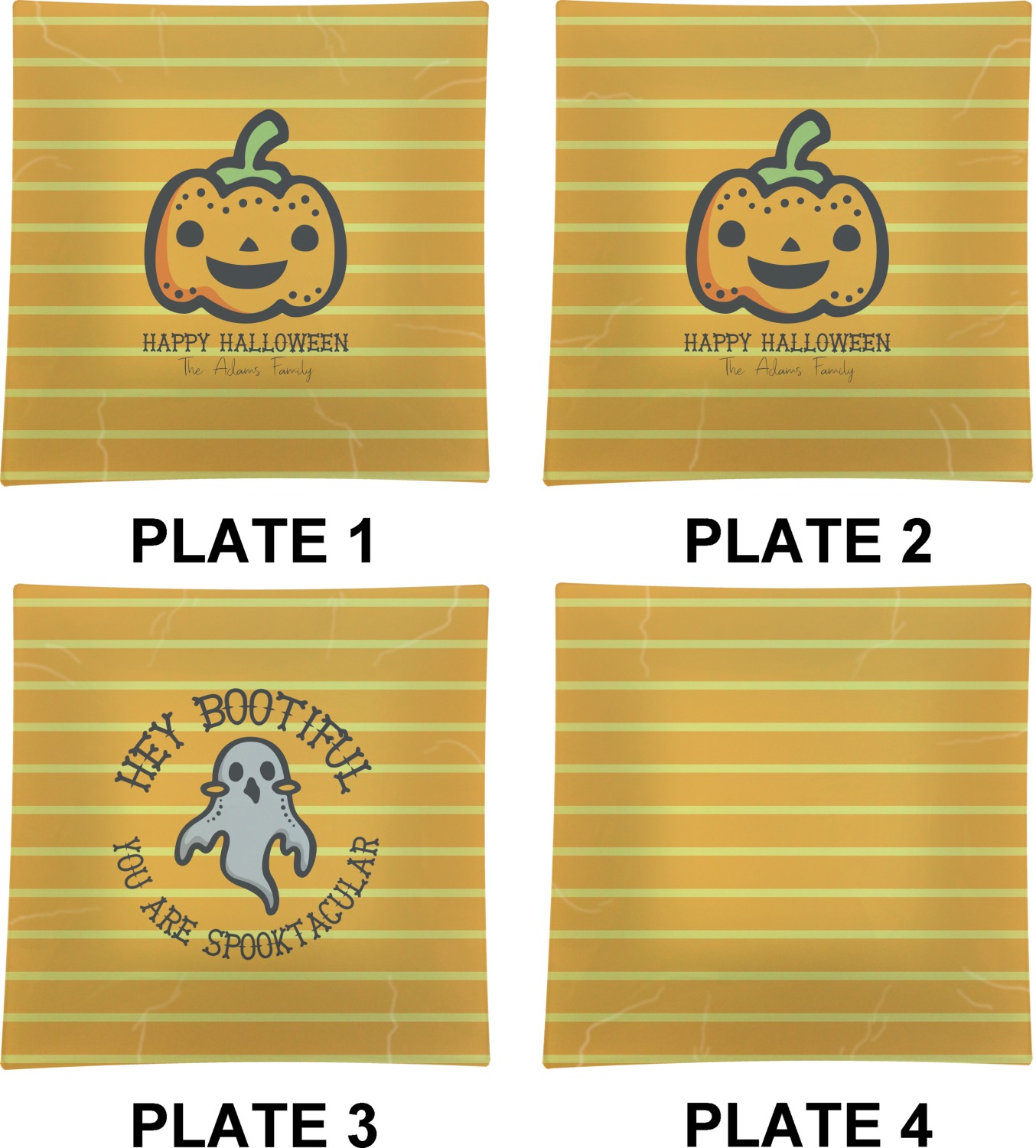 The design features a fun-loving pumpkin as the main focus. He even has a cute little smile on his face that will make you smile right back. The background is a subtle striped one with yellow and orange as the colors. Your personalization or greeting goes directly underneath your pumpkin friend. The coordinating design even has a cute little ghost who thinks that you are "bootiful" and "spooktacular."