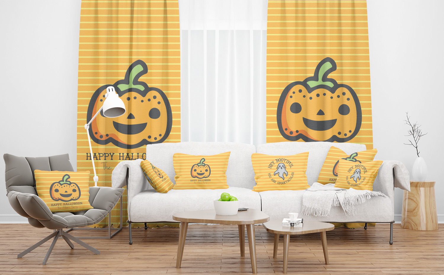 The design features a fun-loving pumpkin as the main focus. He even has a cute little smile on his face that will make you smile right back. The background is a subtle striped one with yellow and orange as the colors. Your personalization or greeting goes directly underneath your pumpkin friend. The coordinating design even has a cute little ghost who thinks that you are "bootiful" and "spooktacular."