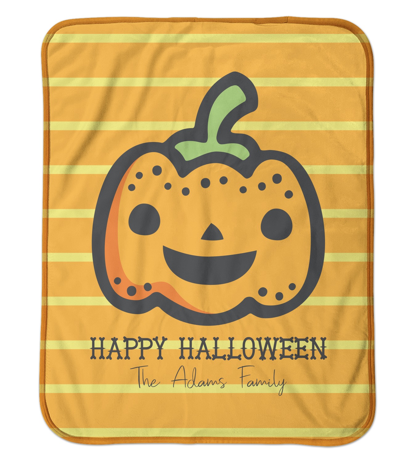 The design features a fun-loving pumpkin as the main focus. He even has a cute little smile on his face that will make you smile right back. The background is a subtle striped one with yellow and orange as the colors. Your personalization or greeting goes directly underneath your pumpkin friend. The coordinating design even has a cute little ghost who thinks that you are "bootiful" and "spooktacular."