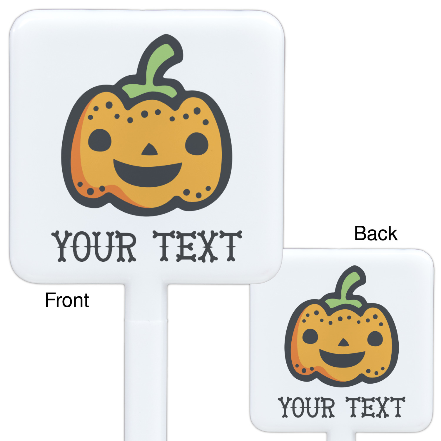 The design features a fun-loving pumpkin as the main focus. He even has a cute little smile on his face that will make you smile right back. The background is a subtle striped one with yellow and orange as the colors. Your personalization or greeting goes directly underneath your pumpkin friend. The coordinating design even has a cute little ghost who thinks that you are "bootiful" and "spooktacular."
