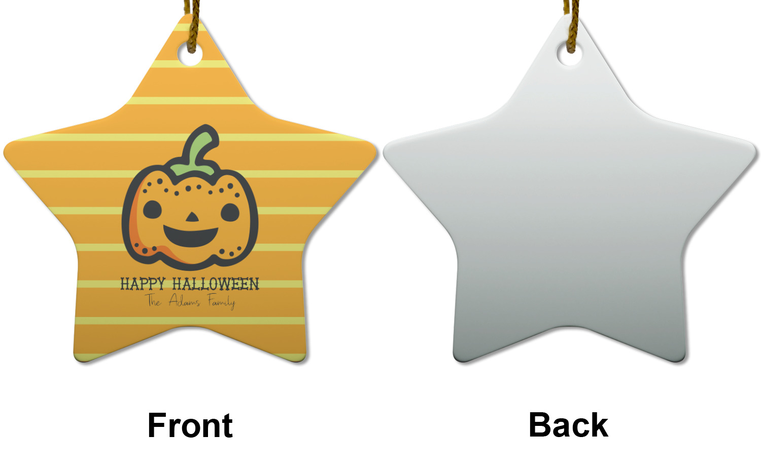 The design features a fun-loving pumpkin as the main focus. He even has a cute little smile on his face that will make you smile right back. The background is a subtle striped one with yellow and orange as the colors. Your personalization or greeting goes directly underneath your pumpkin friend. The coordinating design even has a cute little ghost who thinks that you are "bootiful" and "spooktacular."