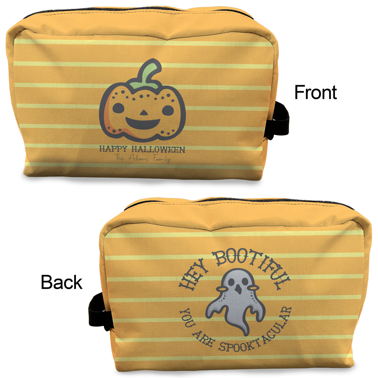 The design features a fun-loving pumpkin as the main focus. He even has a cute little smile on his face that will make you smile right back. The background is a subtle striped one with yellow and orange as the colors. Your personalization or greeting goes directly underneath your pumpkin friend. The coordinating design even has a cute little ghost who thinks that you are "bootiful" and "spooktacular."