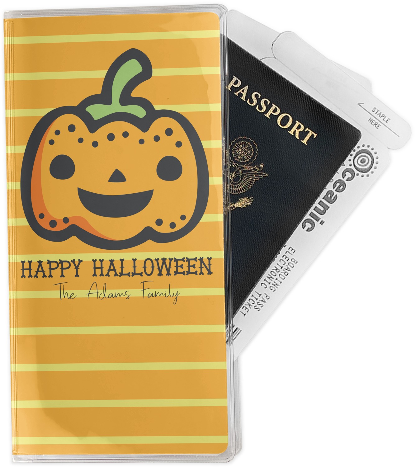 The design features a fun-loving pumpkin as the main focus. He even has a cute little smile on his face that will make you smile right back. The background is a subtle striped one with yellow and orange as the colors. Your personalization or greeting goes directly underneath your pumpkin friend. The coordinating design even has a cute little ghost who thinks that you are "bootiful" and "spooktacular."