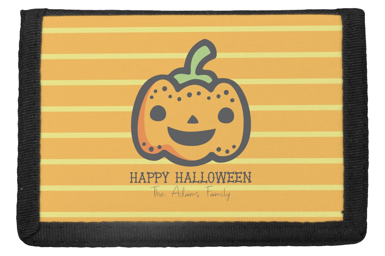 The design features a fun-loving pumpkin as the main focus. He even has a cute little smile on his face that will make you smile right back. The background is a subtle striped one with yellow and orange as the colors. Your personalization or greeting goes directly underneath your pumpkin friend. The coordinating design even has a cute little ghost who thinks that you are "bootiful" and "spooktacular."
