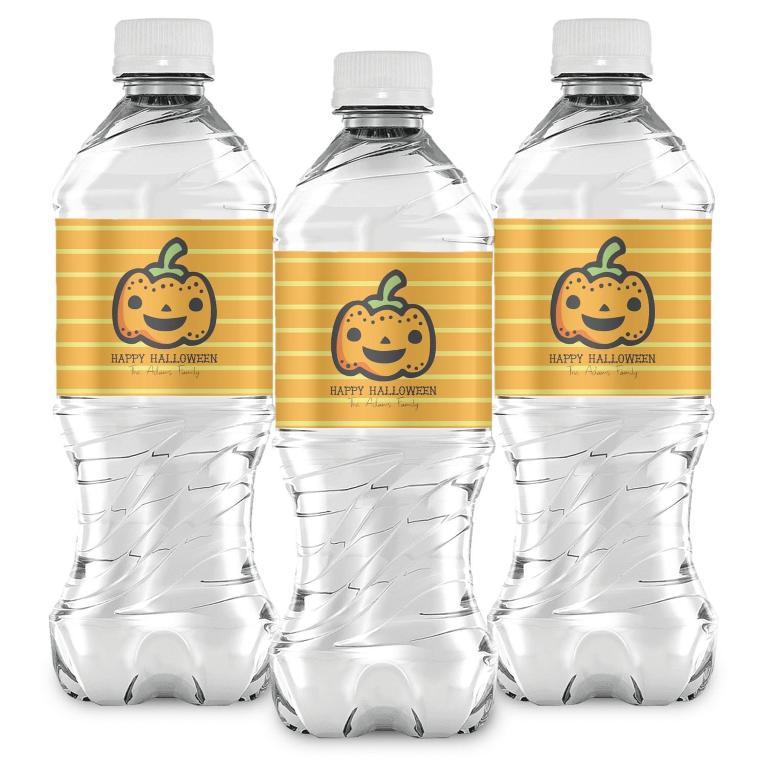 The design features a fun-loving pumpkin as the main focus. He even has a cute little smile on his face that will make you smile right back. The background is a subtle striped one with yellow and orange as the colors. Your personalization or greeting goes directly underneath your pumpkin friend. The coordinating design even has a cute little ghost who thinks that you are "bootiful" and "spooktacular."