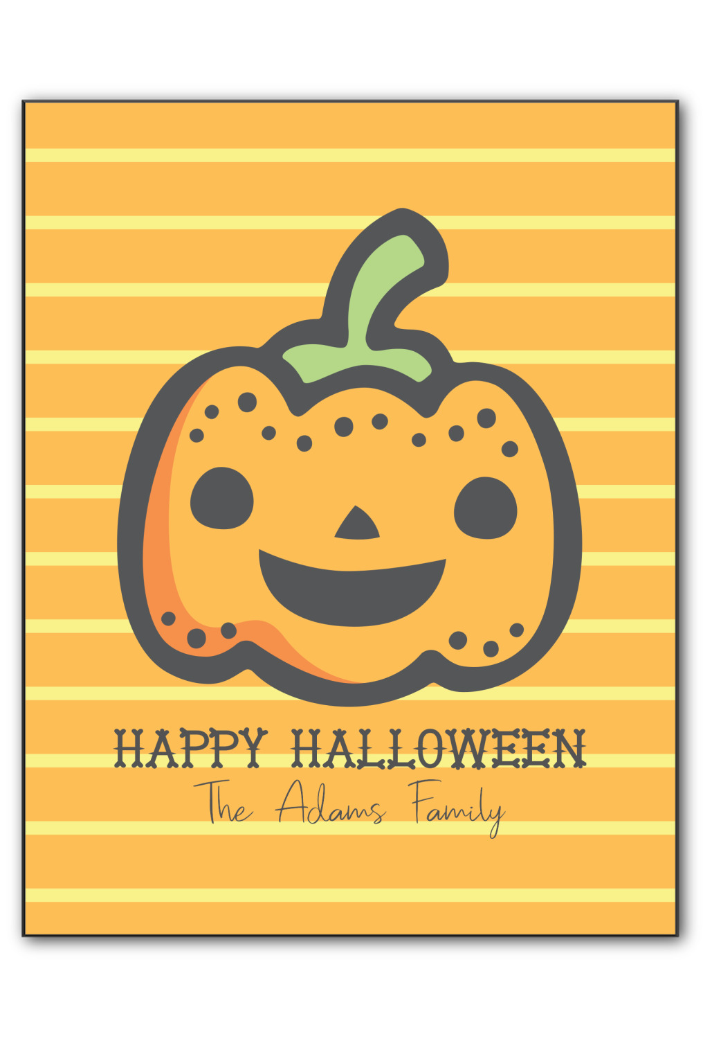 The design features a fun-loving pumpkin as the main focus. He even has a cute little smile on his face that will make you smile right back. The background is a subtle striped one with yellow and orange as the colors. Your personalization or greeting goes directly underneath your pumpkin friend. The coordinating design even has a cute little ghost who thinks that you are "bootiful" and "spooktacular."