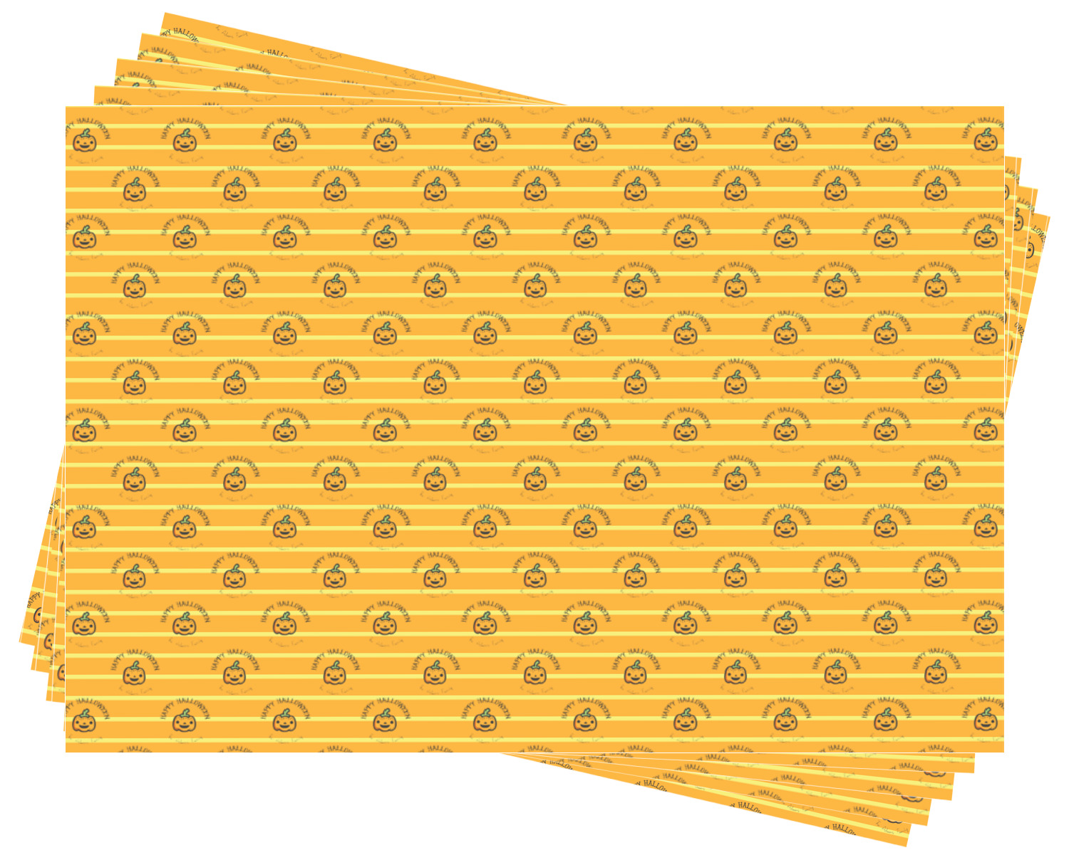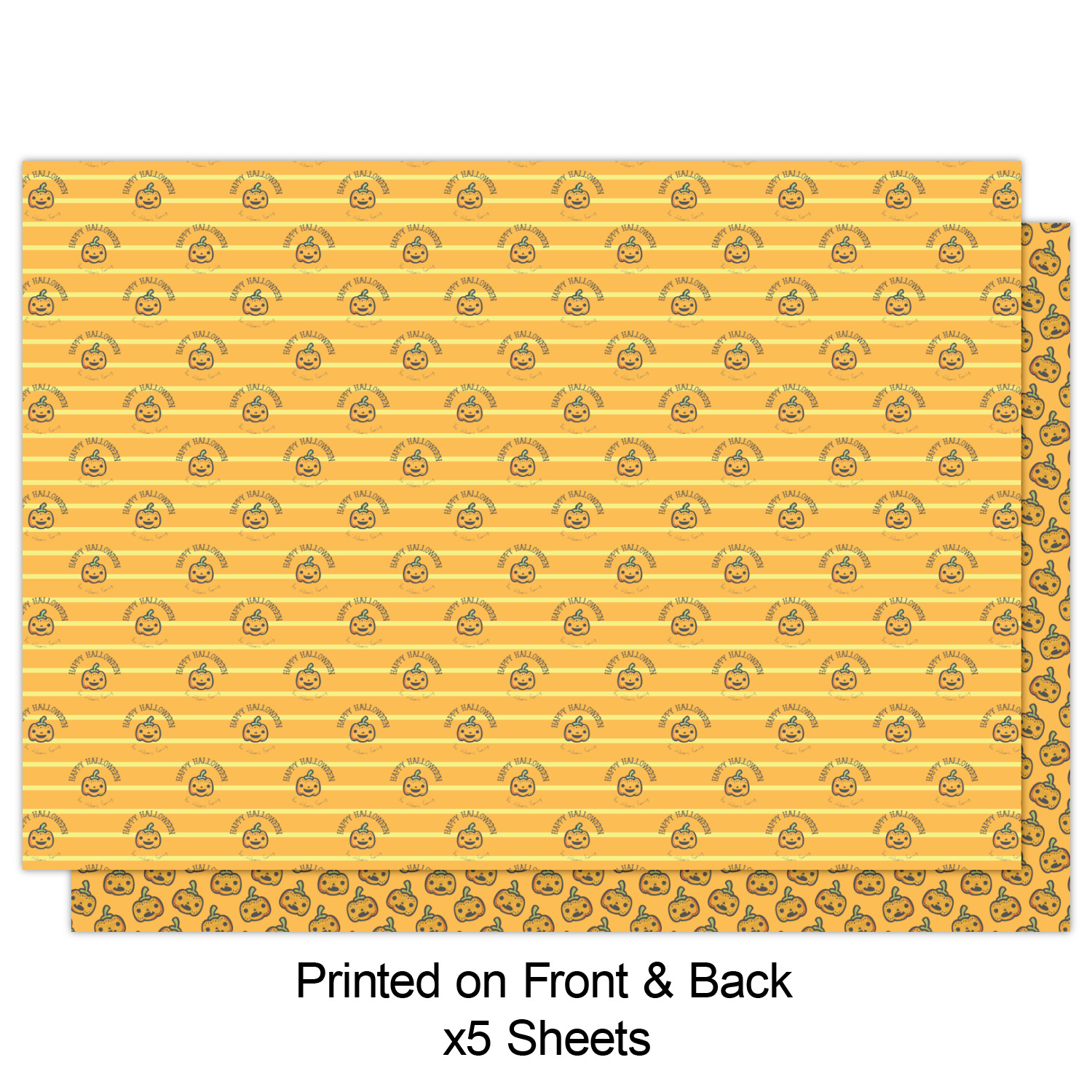 The design features a fun-loving pumpkin as the main focus. He even has a cute little smile on his face that will make you smile right back. The background is a subtle striped one with yellow and orange as the colors. Your personalization or greeting goes directly underneath your pumpkin friend. The coordinating design even has a cute little ghost who thinks that you are "bootiful" and "spooktacular."