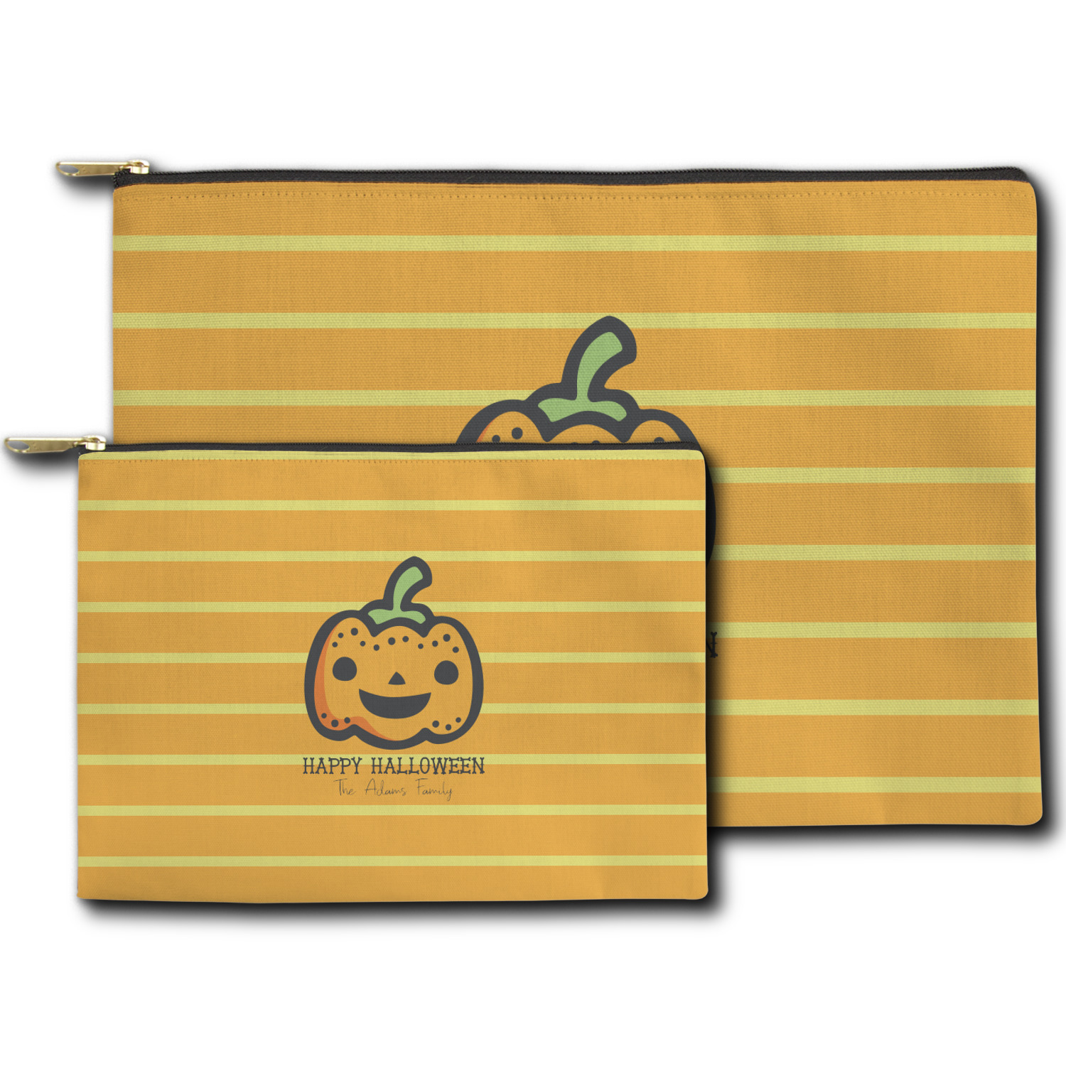 Our zippered pouches are available in two sizes - small: approx 8.5W"x6H and large: approx 12.5Wx8.5H. The pouches are made from a soft & durable canvas fabric that is printed on the outside with your design; the inside has a fused black lining. The printed canvas fabric is then cut and the pouches are sewn right here in the USA. The zipper itself is gold in color and has a round hook.