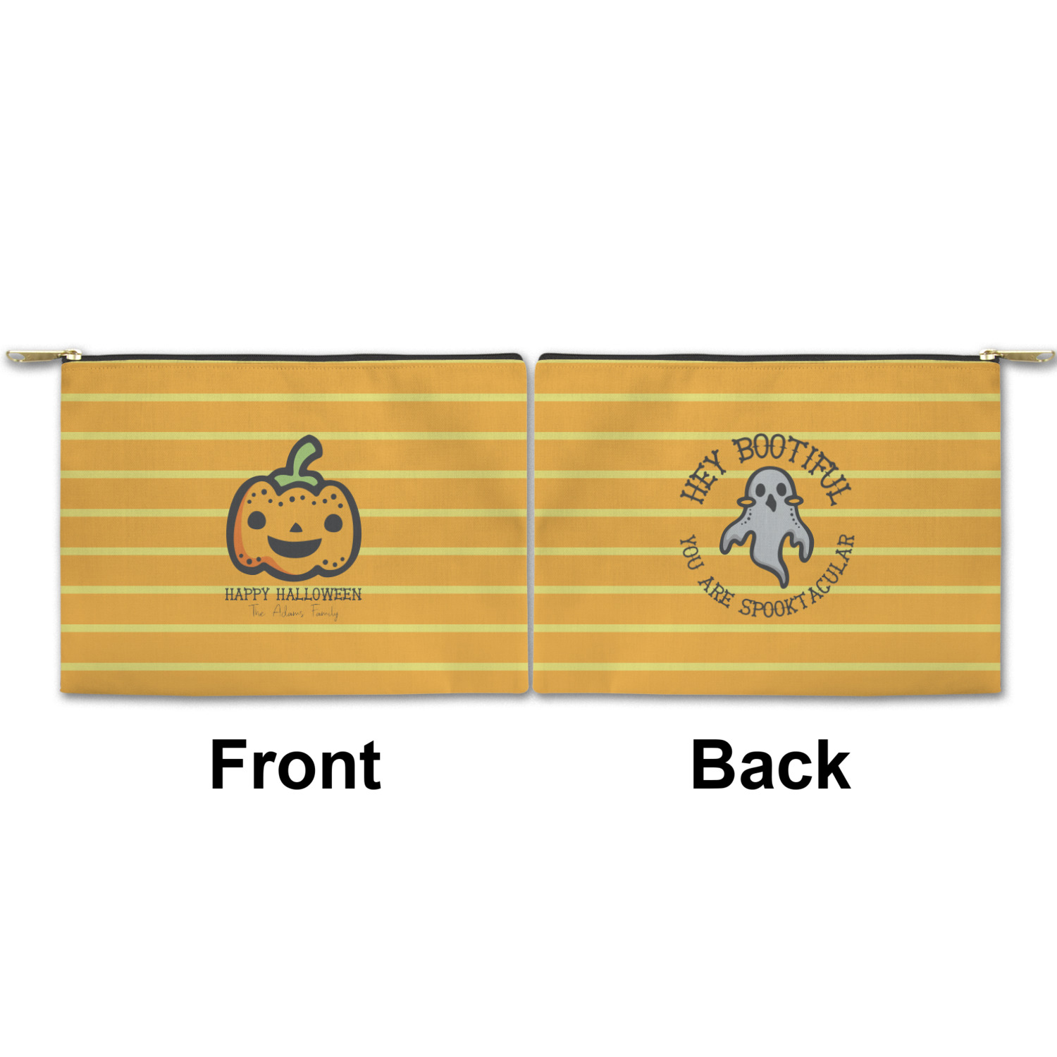The design features a fun-loving pumpkin as the main focus. He even has a cute little smile on his face that will make you smile right back. The background is a subtle striped one with yellow and orange as the colors. Your personalization or greeting goes directly underneath your pumpkin friend. The coordinating design even has a cute little ghost who thinks that you are "bootiful" and "spooktacular."