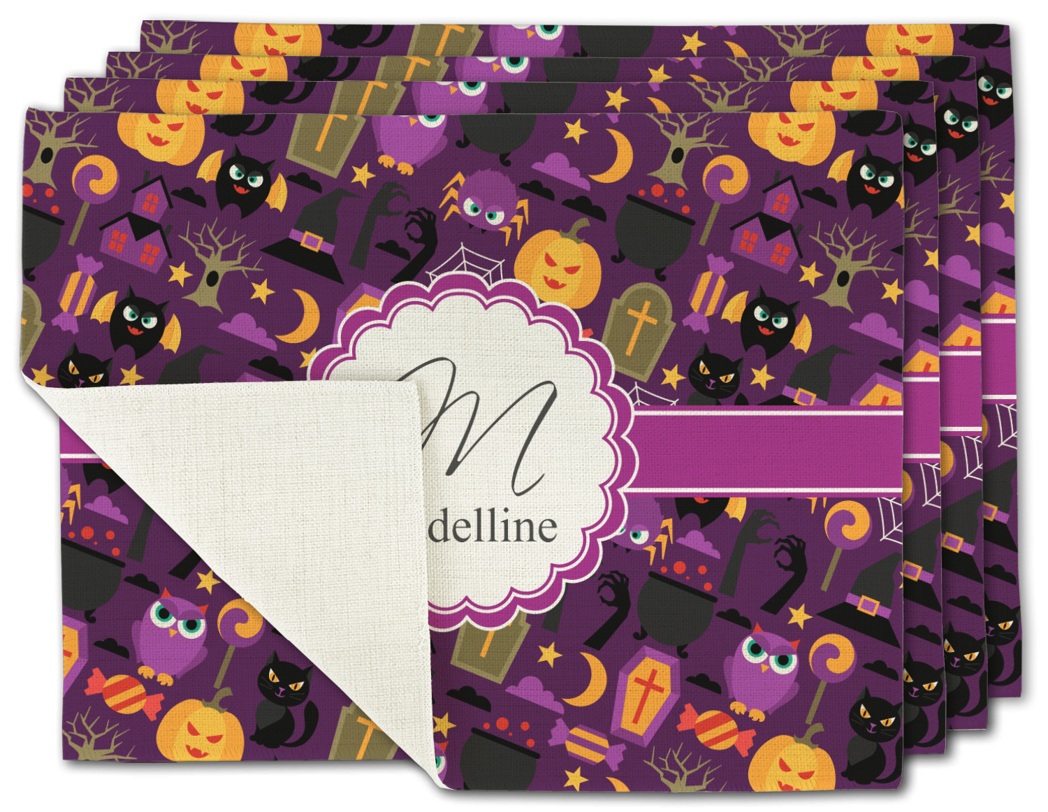 Halloween: a night filled with witch's hats, cauldrons overflowing with bubbly substances, jack-o'-lanterns, and of course, CANDY. This design brings together all your favorite things from October 31st on a deep violet background, the most mysterious color of all.