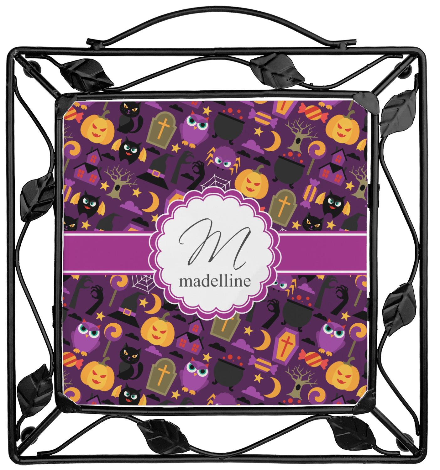 Our square trivets are made from a durable, wrought iron. This model features 4 small half circles, one on each corner, and a larger ring of iron that circles the central, customized tile. Each of the 4 corners has a round foot on its bottom for stability. This trivet is 8.75 by 8.75 inches, but the central tile measures at 6 inches on both sides.