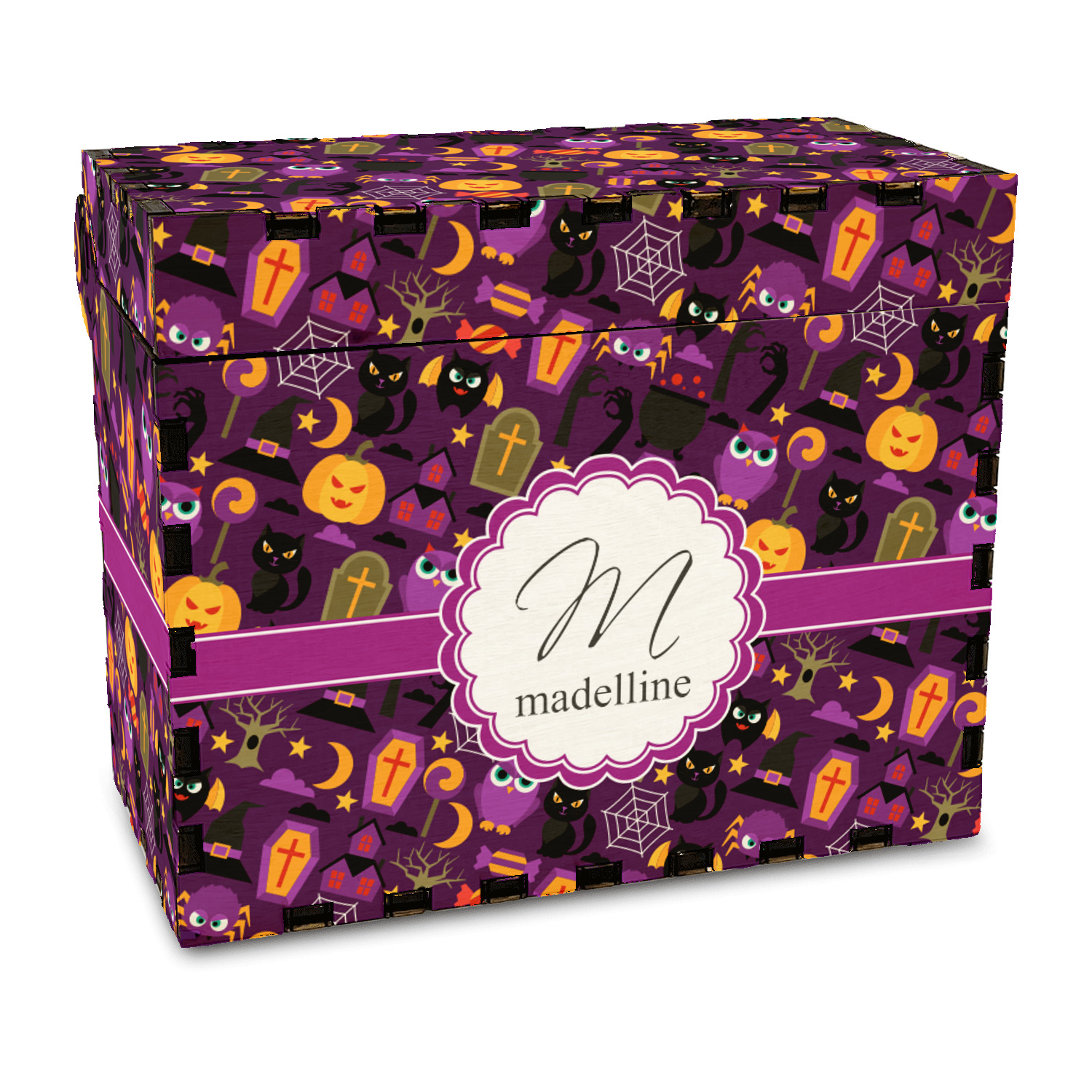 Halloween: a night filled with witch's hats, cauldrons overflowing with bubbly substances, jack-o'-lanterns, and of course, CANDY. This design brings together all your favorite things from October 31st on a deep violet background, the most mysterious color of all.