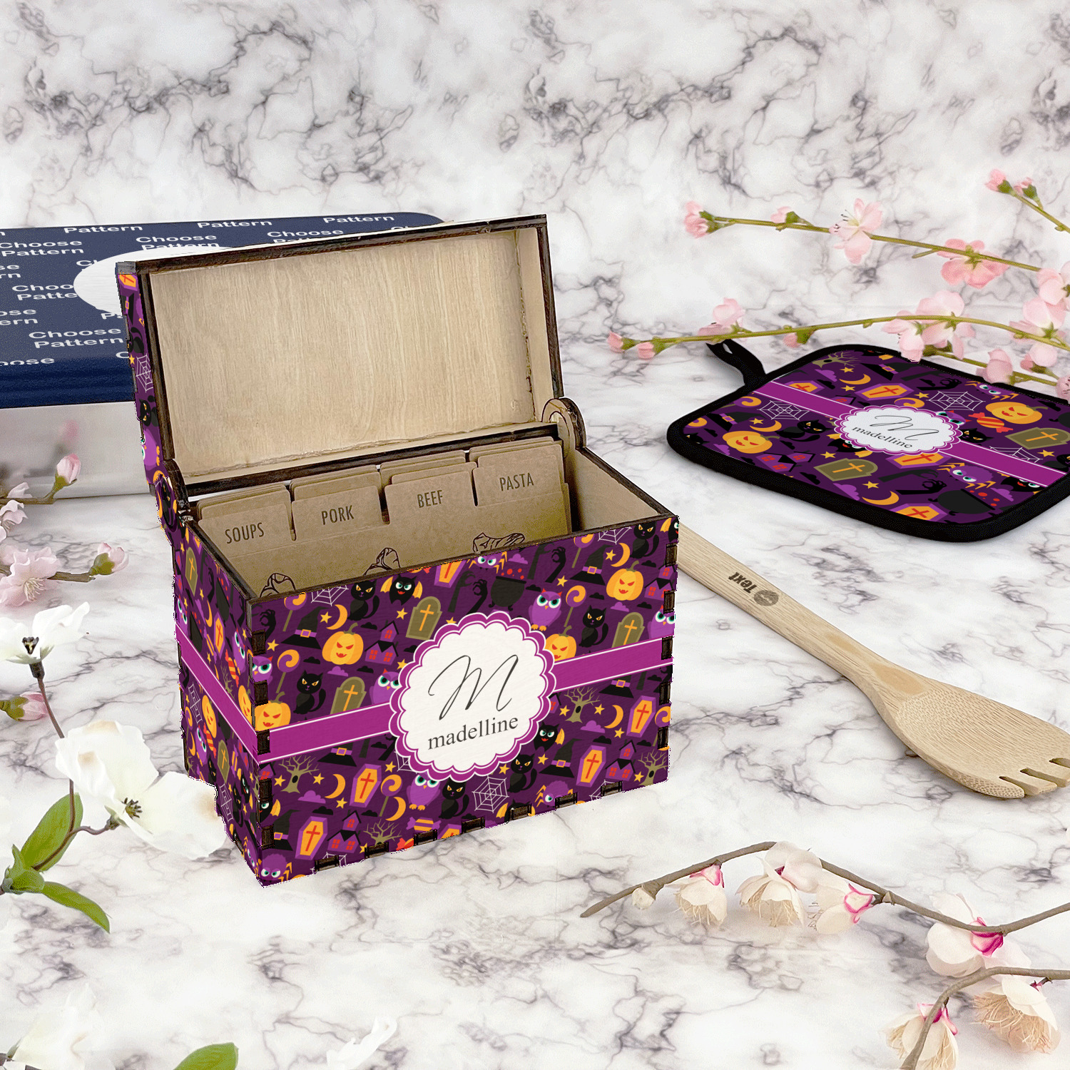 Using our design library you can design your recipe box to be personalized just for you. We will then laser engrave it and assemble it and have it ready for you to insert your recipe cards when you recieve it.