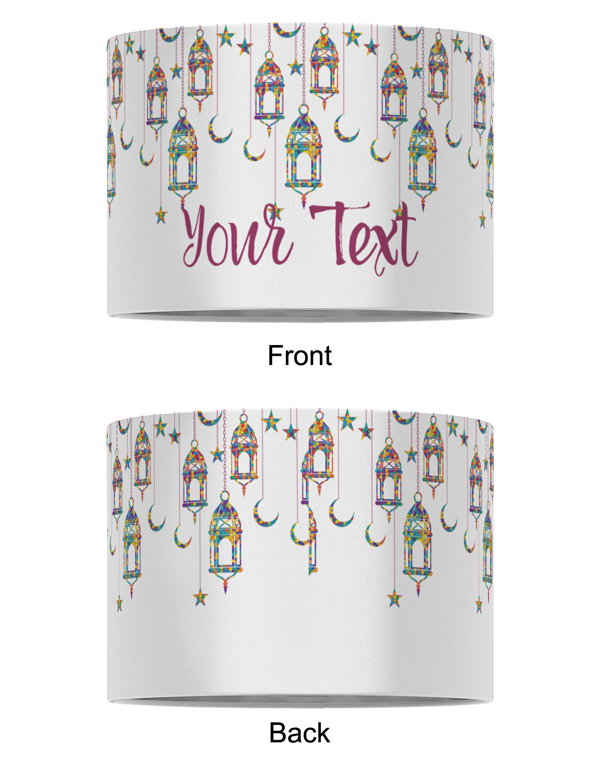 The design consists of brightly colored mosaic style lanterns with stars and moons hanging like chandeliers from chains. You'll find all sorts of colors including blue, green, yellow, and purple. We chose not to personalize the main design, however the default layout has your personalization at the bottom.