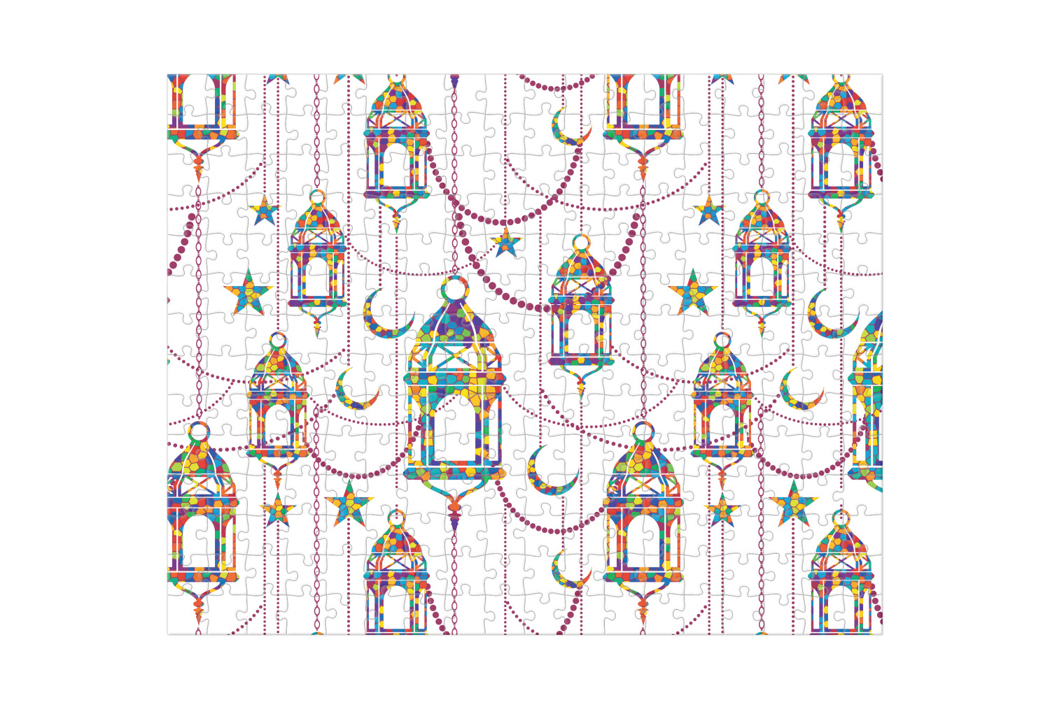 The design consists of brightly colored mosaic style lanterns with stars and moons hanging like chandeliers from chains. You'll find all sorts of colors including blue, green, yellow, and purple. We chose not to personalize the main design, however the default layout has your personalization at the bottom.