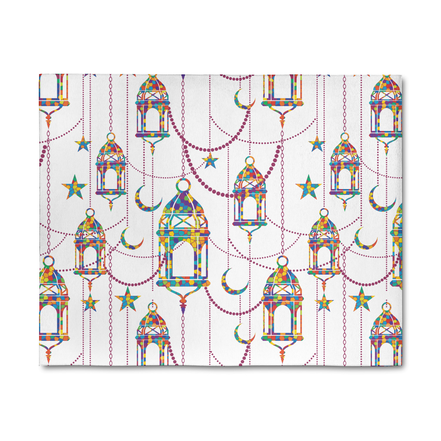 The design consists of brightly colored mosaic style lanterns with stars and moons hanging like chandeliers from chains. You'll find all sorts of colors including blue, green, yellow, and purple. We chose not to personalize the main design, however the default layout has your personalization at the bottom.