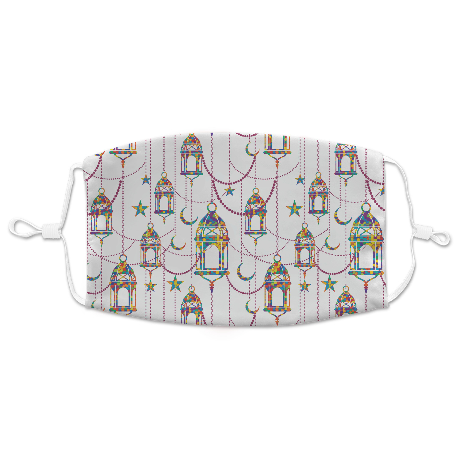 The design consists of brightly colored mosaic style lanterns with stars and moons hanging like chandeliers from chains. You'll find all sorts of colors including blue, green, yellow, and purple. We chose not to personalize the main design, however the default layout has your personalization at the bottom.