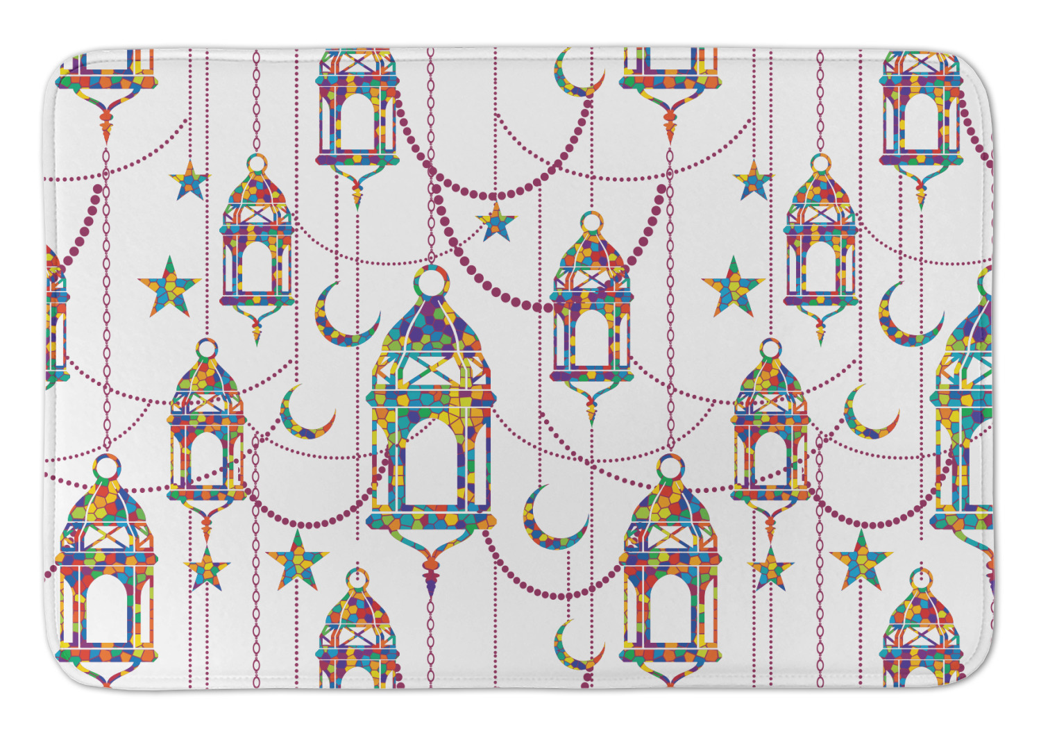 The design consists of brightly colored mosaic style lanterns with stars and moons hanging like chandeliers from chains. You'll find all sorts of colors including blue, green, yellow, and purple. We chose not to personalize the main design, however the default layout has your personalization at the bottom.
