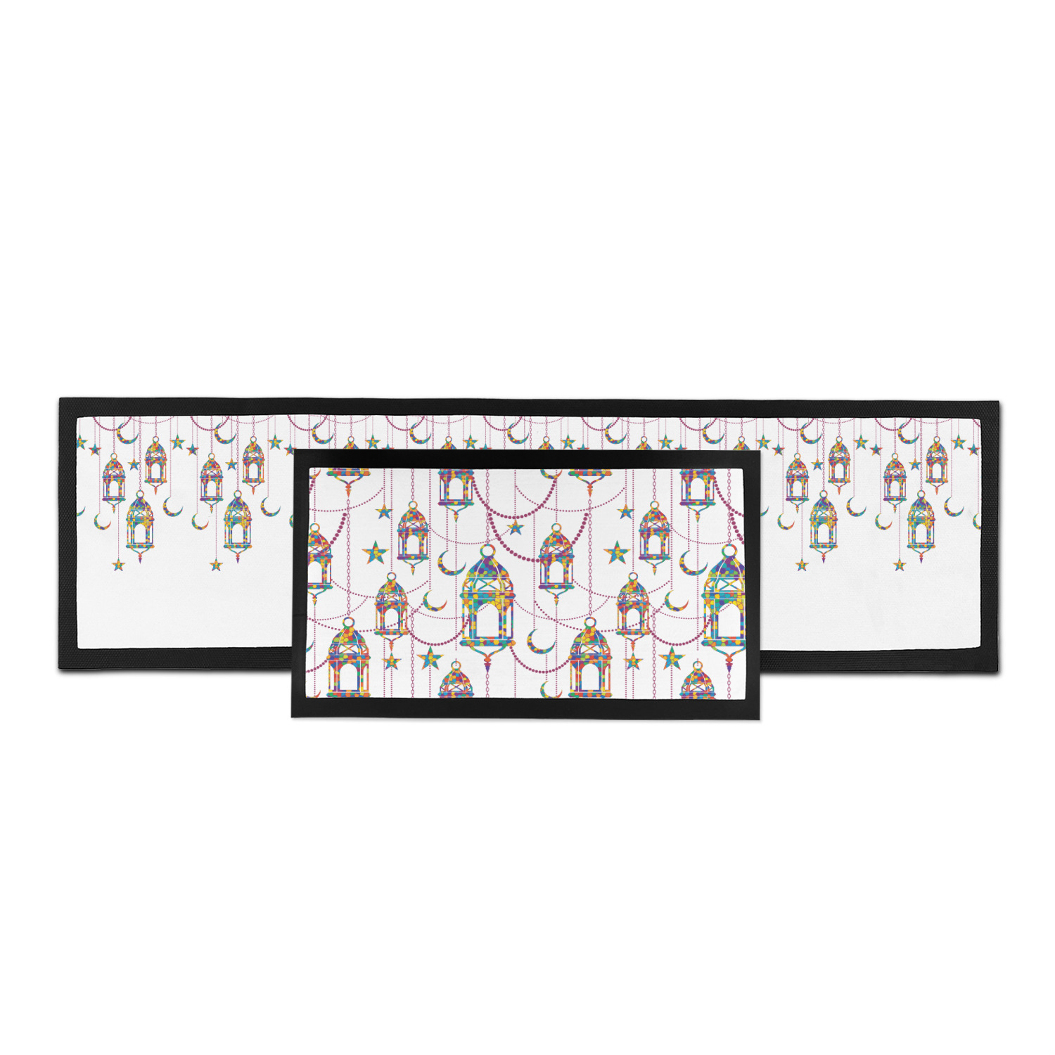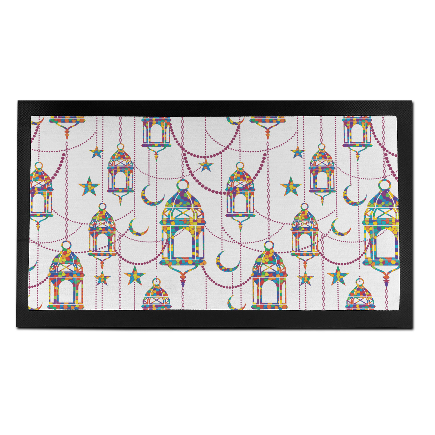 The design consists of brightly colored mosaic style lanterns with stars and moons hanging like chandeliers from chains. You'll find all sorts of colors including blue, green, yellow, and purple. We chose not to personalize the main design, however the default layout has your personalization at the bottom.
