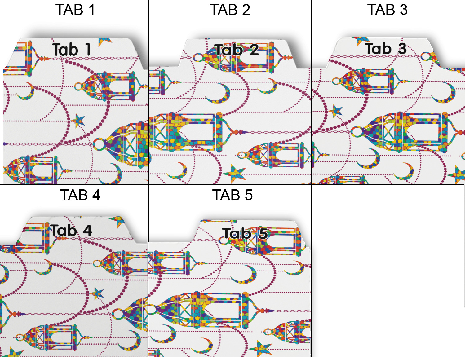 Whether you use binders at school or at work, we have designs to suit all of them. Available in 5 or 6 tab sets, you are sure to find a set to suit your needs. The back of each one is white and can be used to take notes, write vital information on, etc.