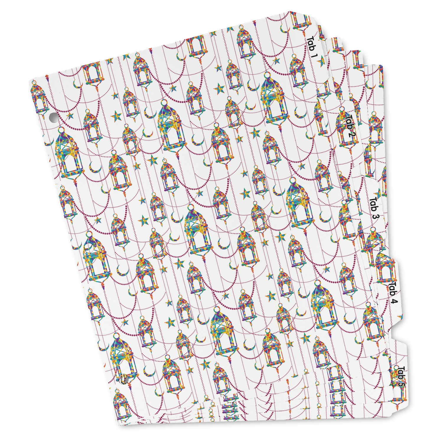 The design consists of brightly colored mosaic style lanterns with stars and moons hanging like chandeliers from chains. You'll find all sorts of colors including blue, green, yellow, and purple. We chose not to personalize the main design, however the default layout has your personalization at the bottom.