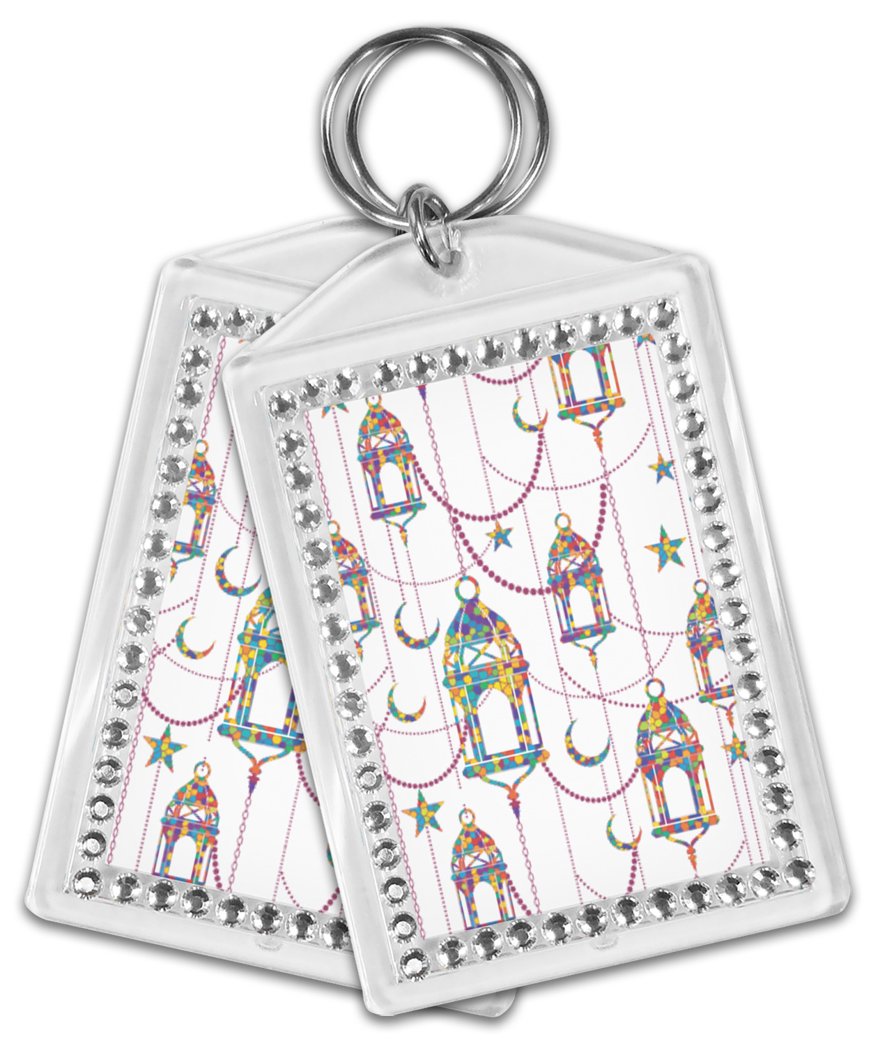 Our personalized keychains have a bold, rectangular shape, outlined by a series of shimmering rhinestones. A metal, split keyring is included with your purchase, and an additional metal hoop allows for attachment of the keychain to the split ring. This unique keychain measures at about 3.75 by 2.5 inches. We print your customized design(s) across both the back and front of this keychain.