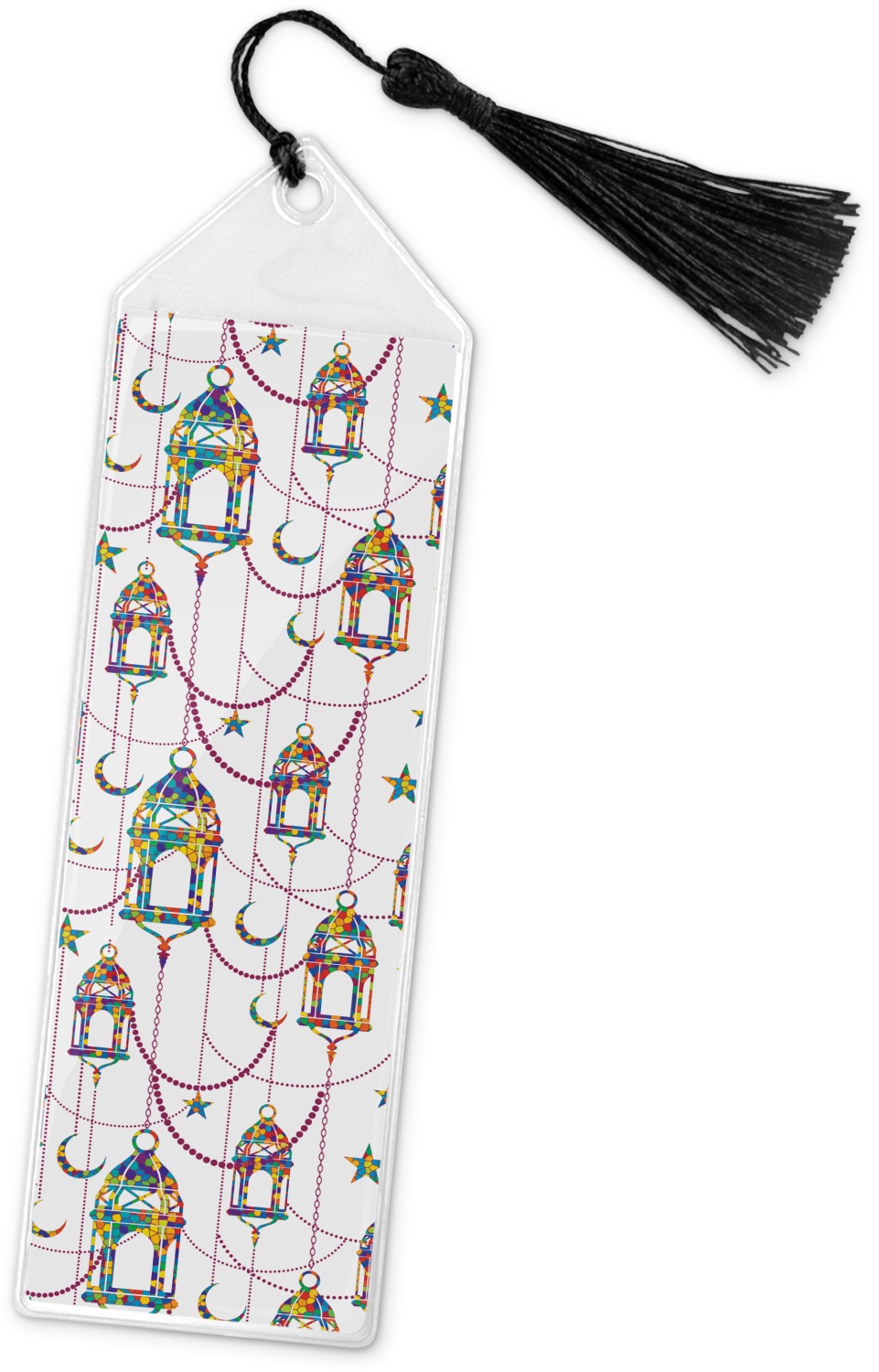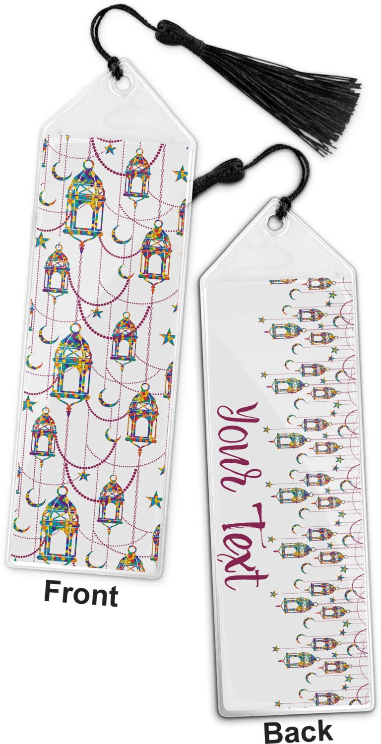 Your personalized bookmark is made of a sturdy, clear vinyl, and is approximately 7.5" x 2.25". We display your personalization on vinyl inserts that are placed on both sides. Accompanying each book marker is a black, fringe tassel that attaches to the reinforced, triangular header.