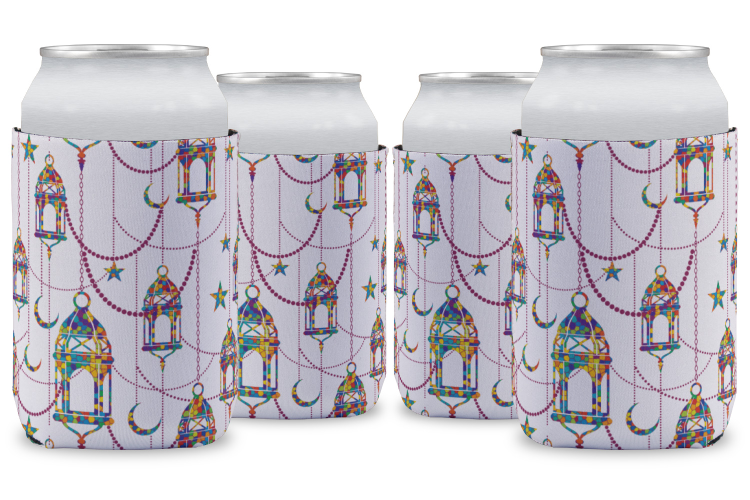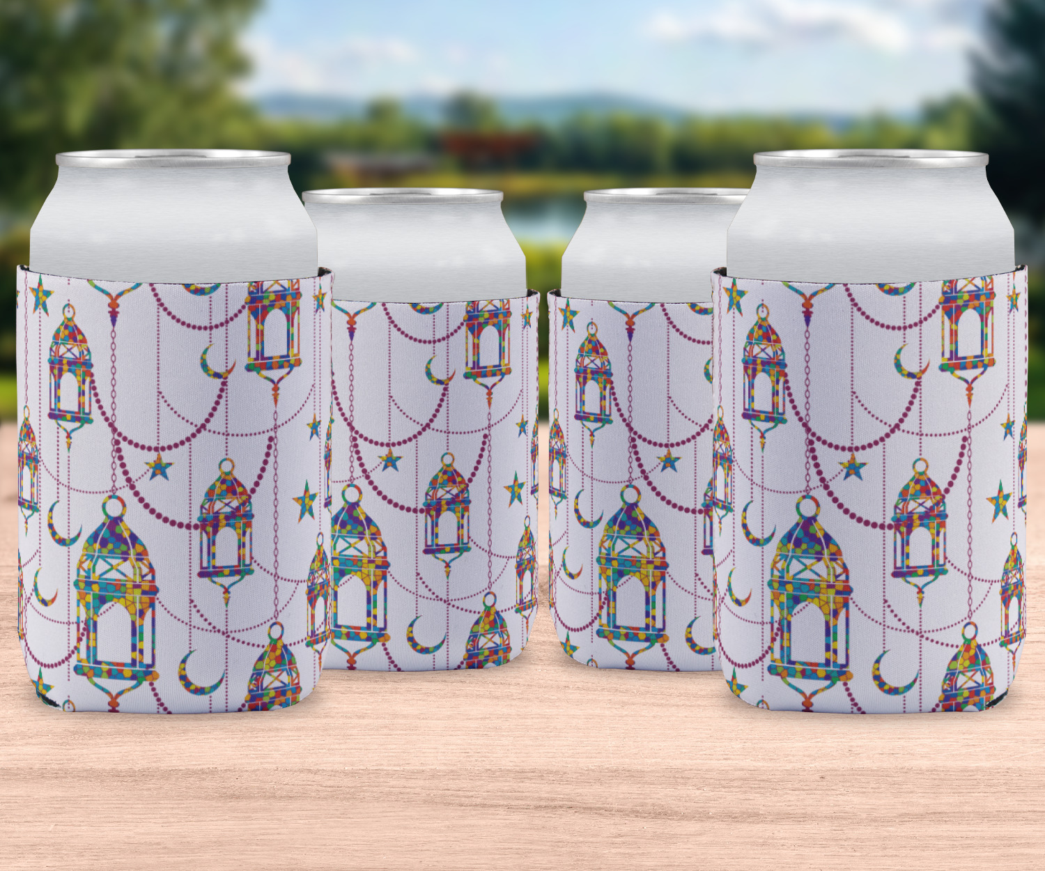 The design consists of brightly colored mosaic style lanterns with stars and moons hanging like chandeliers from chains. You'll find all sorts of colors including blue, green, yellow, and purple. We chose not to personalize the main design, however the default layout has your personalization at the bottom.