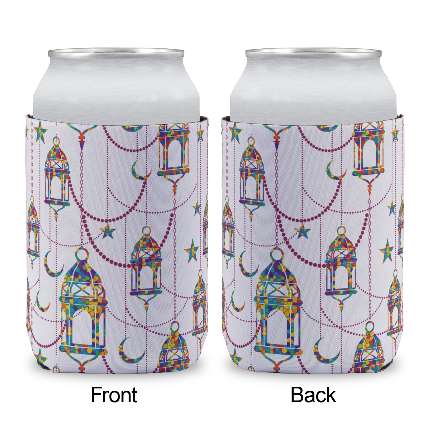 The design consists of brightly colored mosaic style lanterns with stars and moons hanging like chandeliers from chains. You'll find all sorts of colors including blue, green, yellow, and purple. We chose not to personalize the main design, however the default layout has your personalization at the bottom.