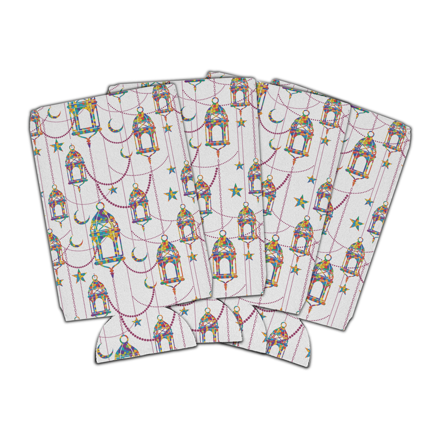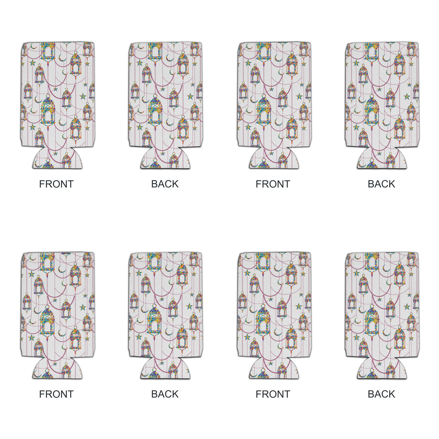 The design consists of brightly colored mosaic style lanterns with stars and moons hanging like chandeliers from chains. You'll find all sorts of colors including blue, green, yellow, and purple. We chose not to personalize the main design, however the default layout has your personalization at the bottom.