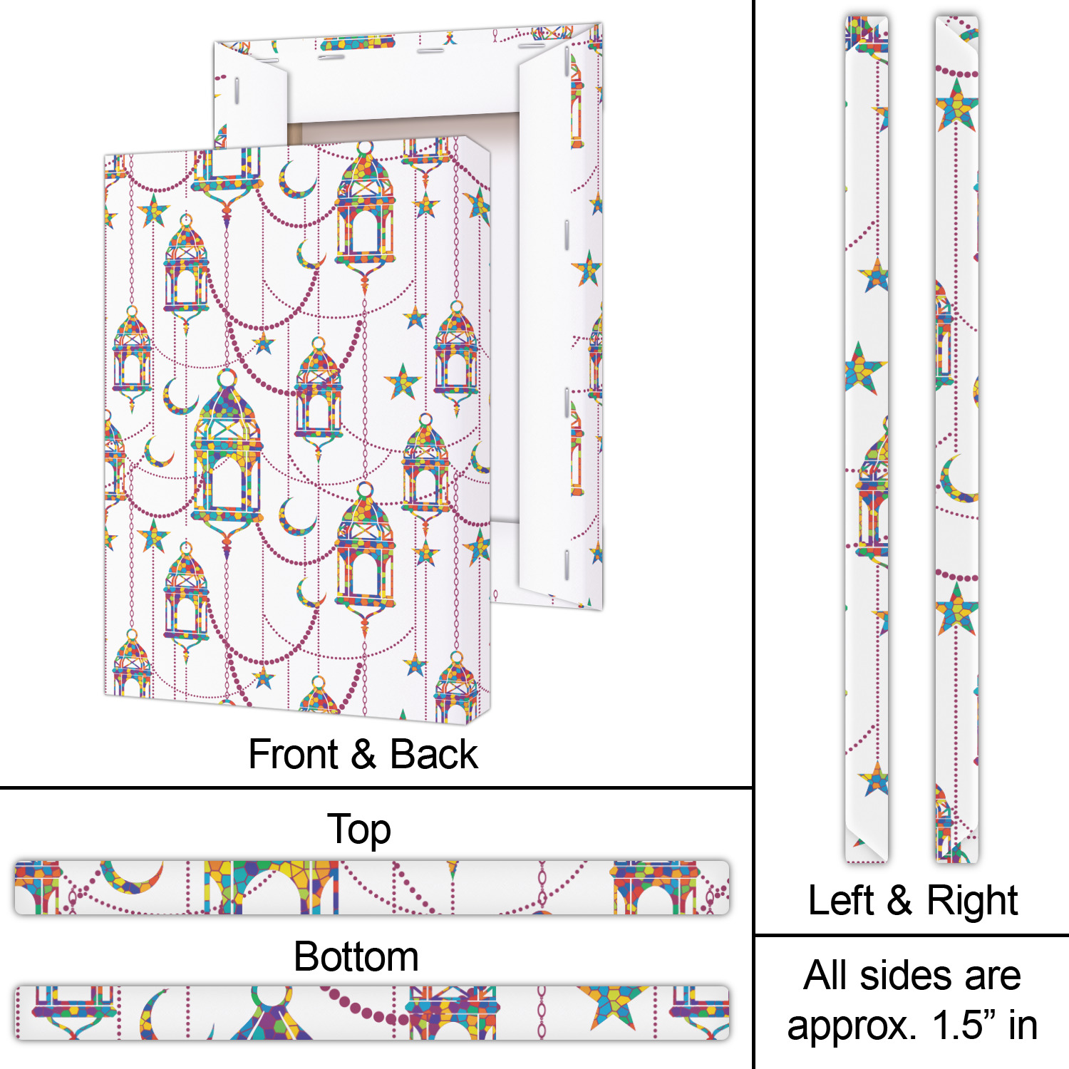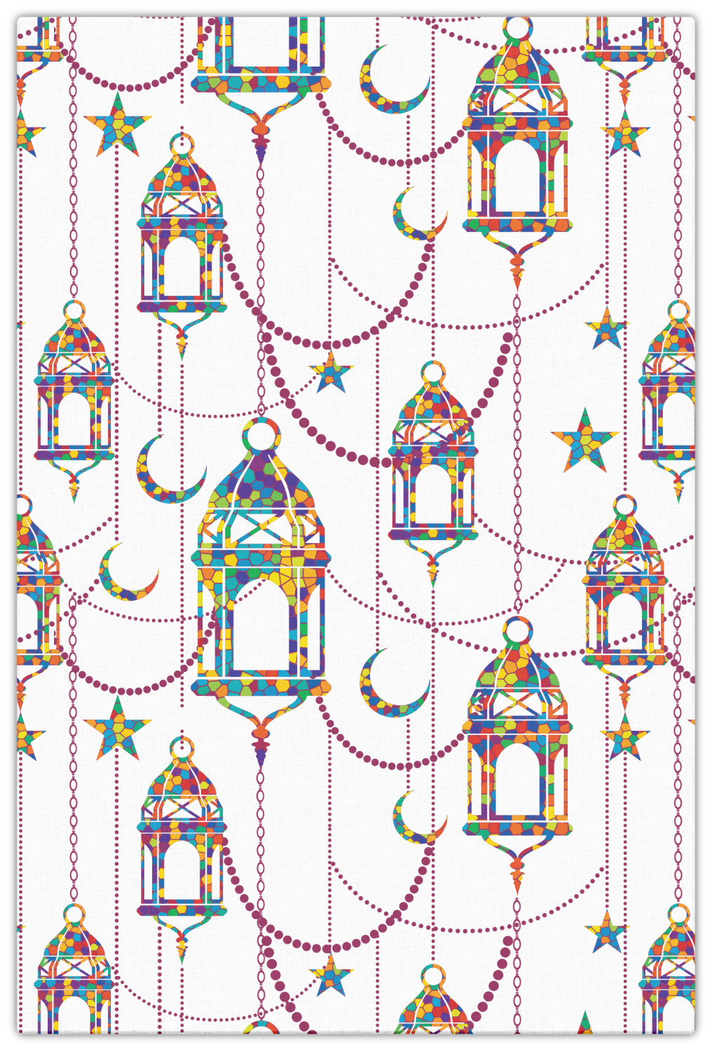The design consists of brightly colored mosaic style lanterns with stars and moons hanging like chandeliers from chains. You'll find all sorts of colors including blue, green, yellow, and purple. We chose not to personalize the main design, however the default layout has your personalization at the bottom.