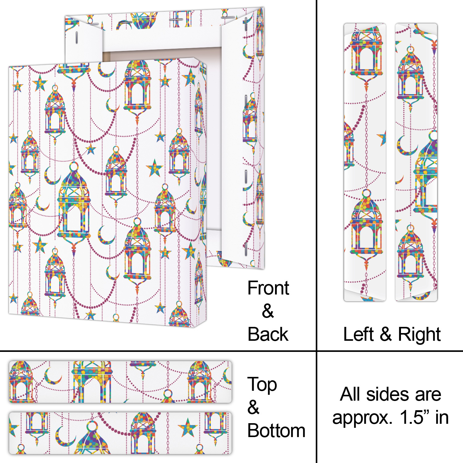 The design consists of brightly colored mosaic style lanterns with stars and moons hanging like chandeliers from chains. You'll find all sorts of colors including blue, green, yellow, and purple. We chose not to personalize the main design, however the default layout has your personalization at the bottom.