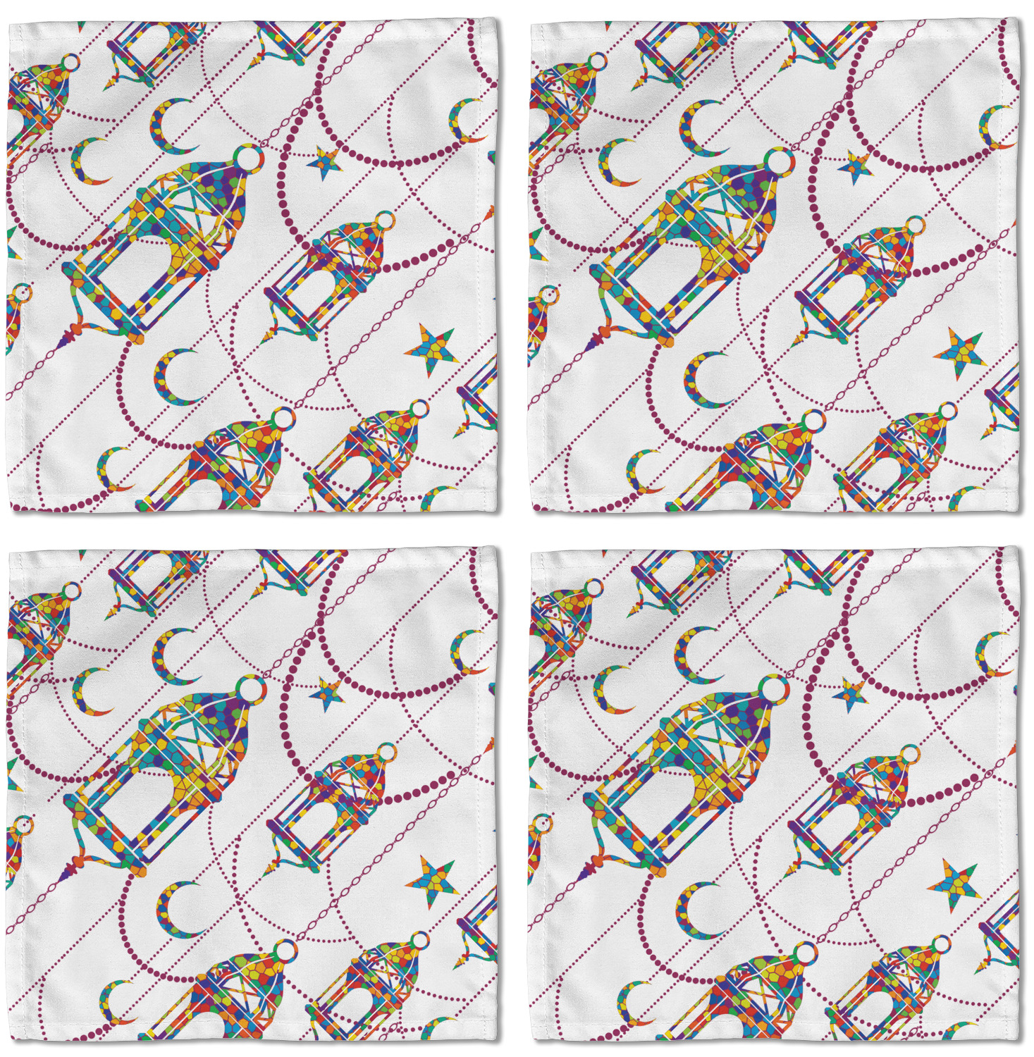 The design consists of brightly colored mosaic style lanterns with stars and moons hanging like chandeliers from chains. You'll find all sorts of colors including blue, green, yellow, and purple. We chose not to personalize the main design, however the default layout has your personalization at the bottom.