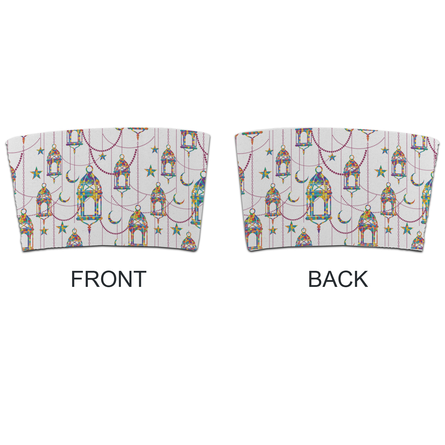 The design consists of brightly colored mosaic style lanterns with stars and moons hanging like chandeliers from chains. You'll find all sorts of colors including blue, green, yellow, and purple. We chose not to personalize the main design, however the default layout has your personalization at the bottom.