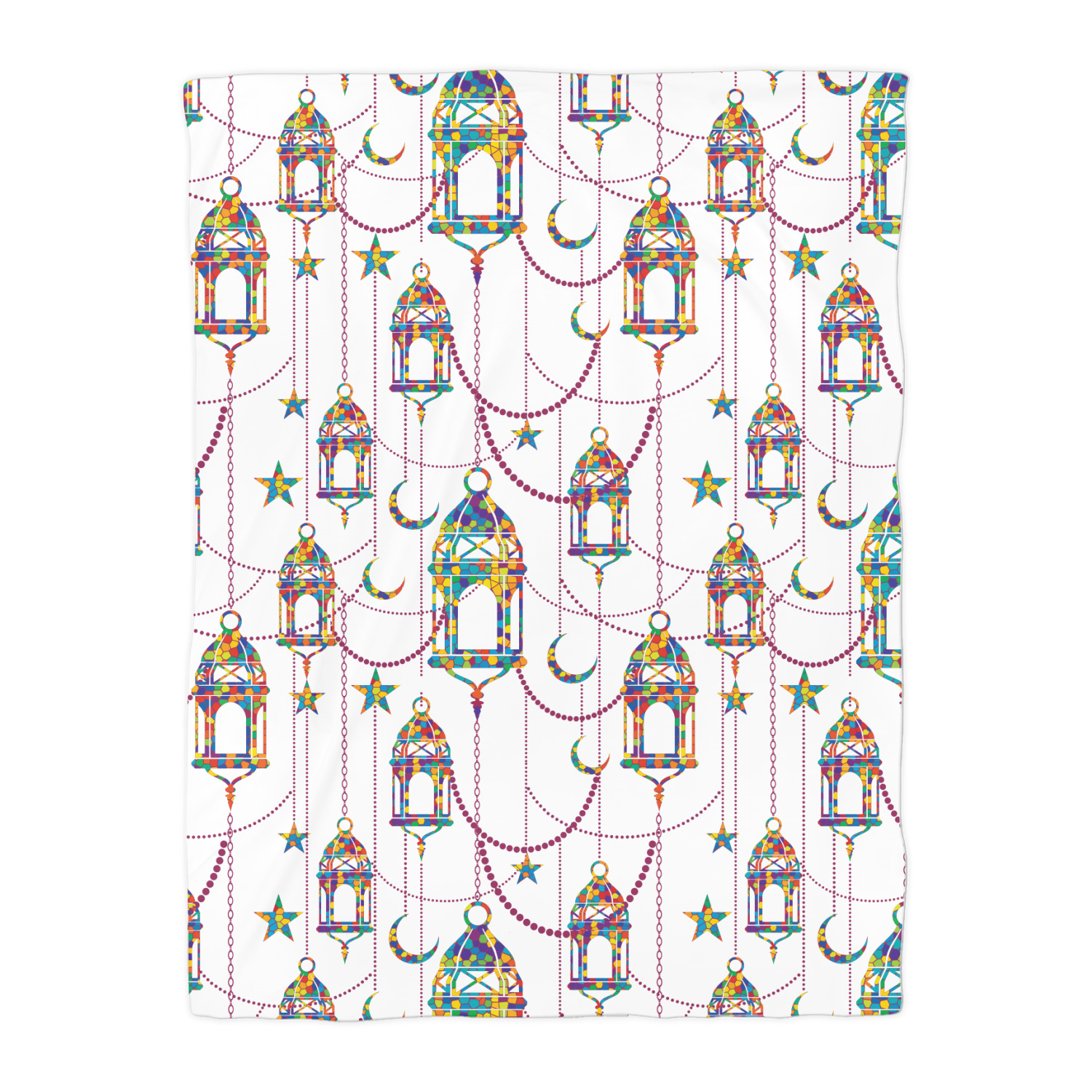 The design consists of brightly colored mosaic style lanterns with stars and moons hanging like chandeliers from chains. You'll find all sorts of colors including blue, green, yellow, and purple. We chose not to personalize the main design, however the default layout has your personalization at the bottom.